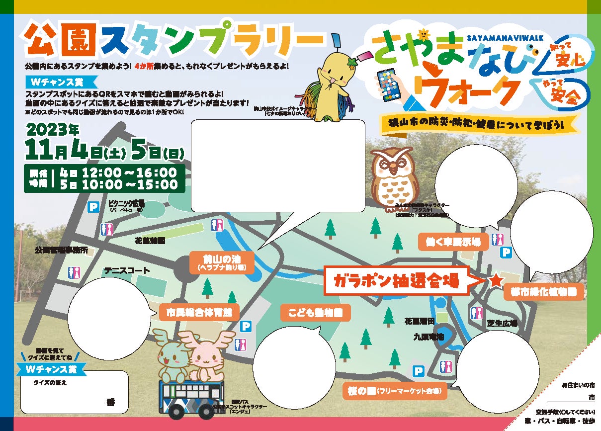 狭山市の人気イベントである<智光山わくわく公園まつり>において、例年行われていたスタンプラリ―に、今年は狭山市の医療インフラである埼玉石心会病院と、交通インフラである西武バスが加わって、『さやまなびウォーク 公園スタンプラリー』と称し、内容をさらに充実させて共同開催しました。