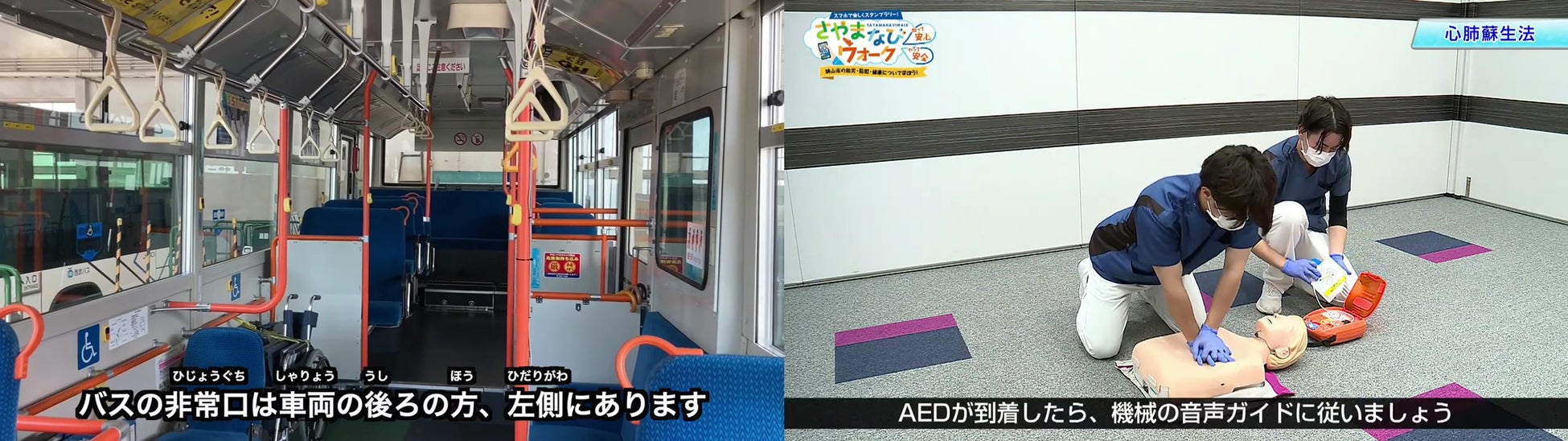 動画で埼玉石心会病院による心肺蘇生や、西武バスによるバスの非常扉について説明