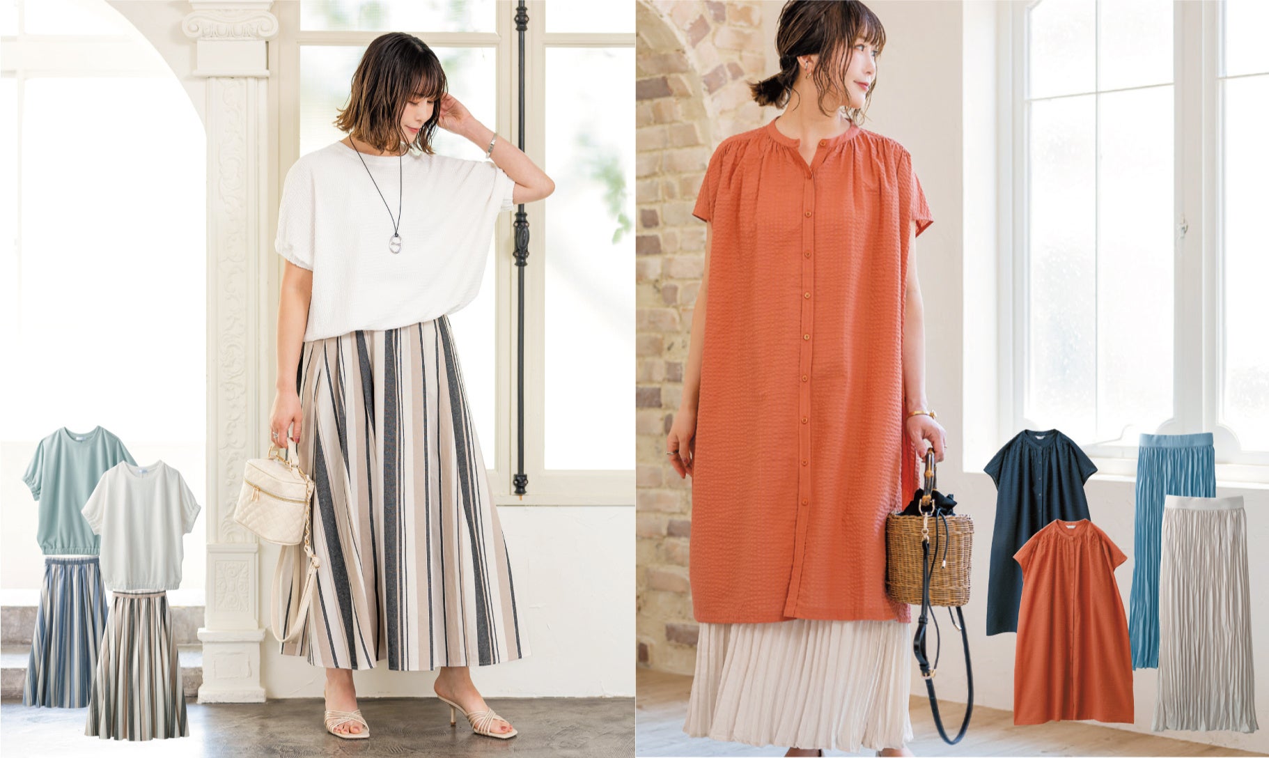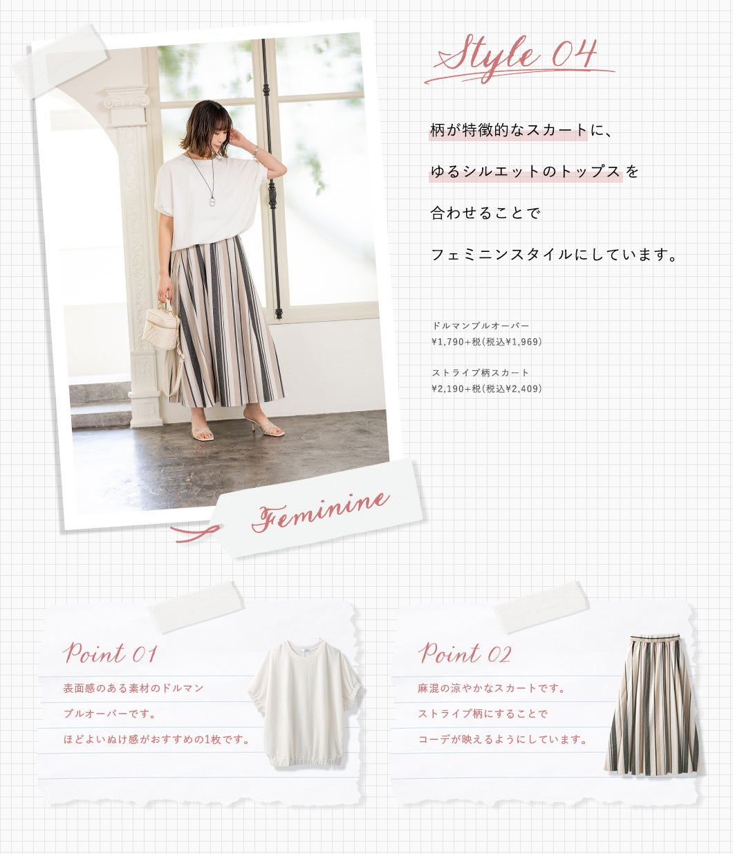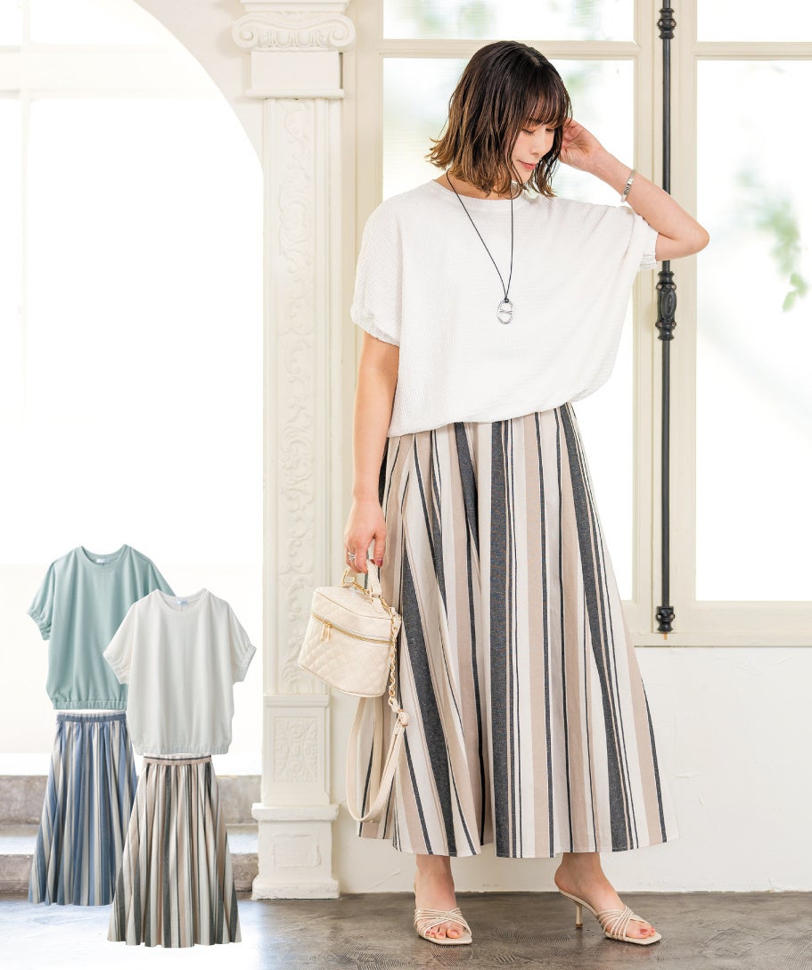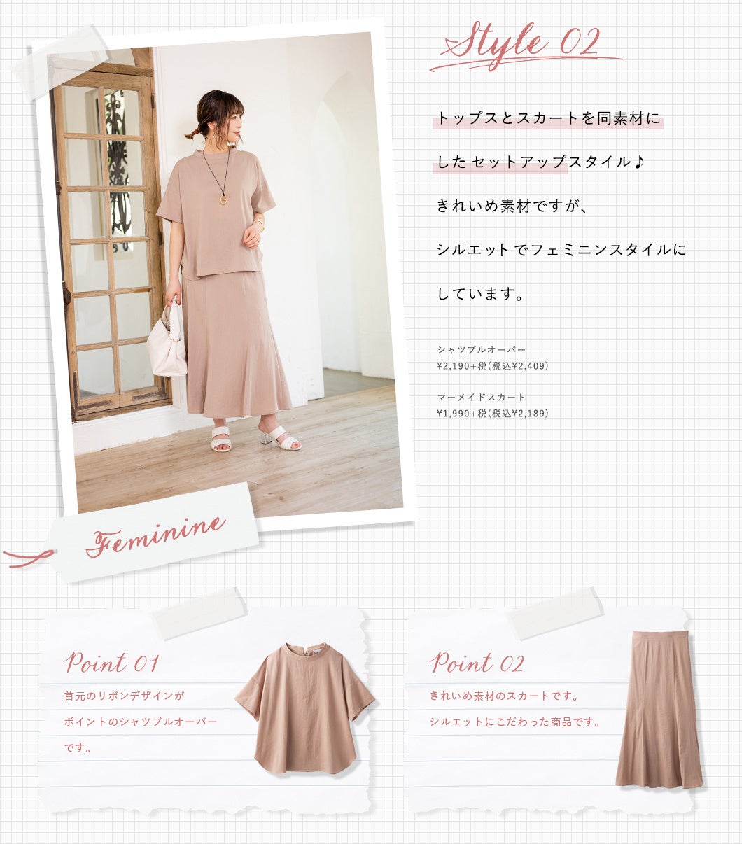 トップスとスカートを同素材にしたセットアップスタイル。きれいめ素材ですが、シルエットでフェミニンスタイルにデザイン。