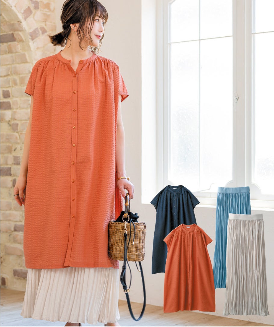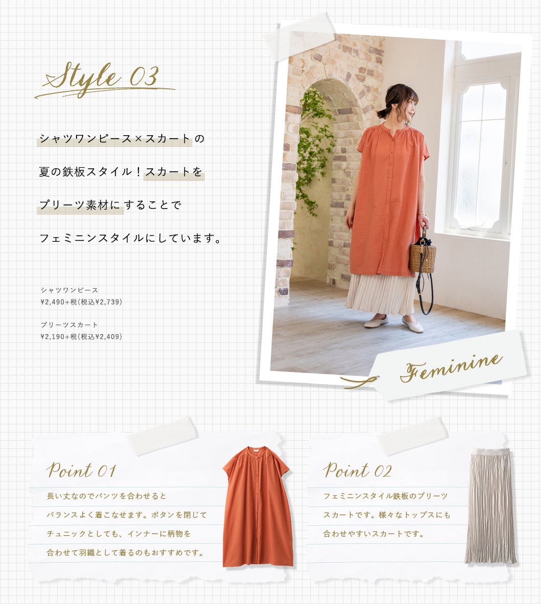 シャツワンピース×スカートの夏の鉄板スタイル!スカートをプリーツ素材にすることでフェミニンスタイルに。
