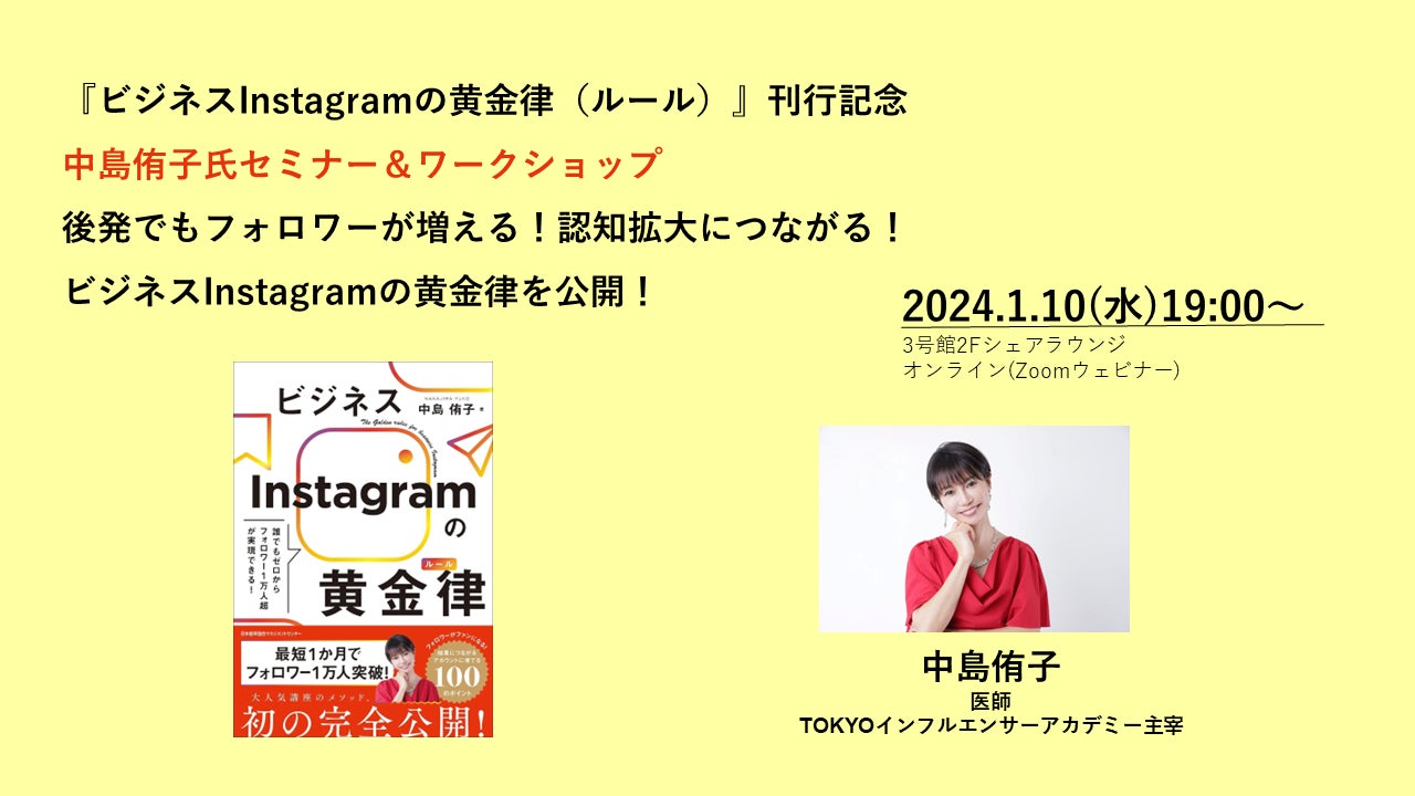 総合フォロワー数302万人を超えるインフルエンサーの学校「TOKYOインフルエンサーアカデミー」を主宰する中島侑子(株式会社パイオニアwoman 代表取締役)は、新書『ビジネスInstagramの黄金律』の刊行を記念して代官山 蔦屋書店が主催するセミナー&ワークショップに2024年1月10日(水)に登壇します。本セミナーはZoomウェビナーでも配信されます。