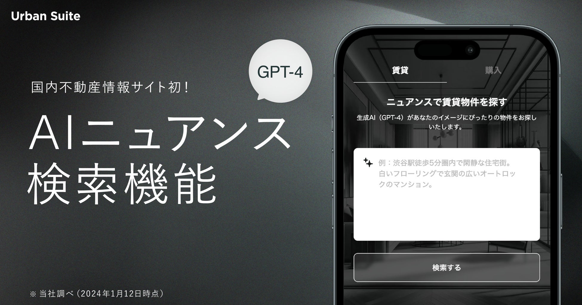 物件の管理から賃貸・売買まで、幅広い不動産サービスを提供する株式会社東京オルガン不動産(本社:東京都渋谷区、代表取締役社長:高橋正茂、以下「東京オルガン不動産」)が運営する不動産・住宅情報サービス「Urban Suite(アーバンスイート)」は、2024年1月12日(金)にOpenAI社が提供する大規模言語モデル(LLM)であるGPT-4を活用した「AIニュアンス検索機能」を提供開始しました。