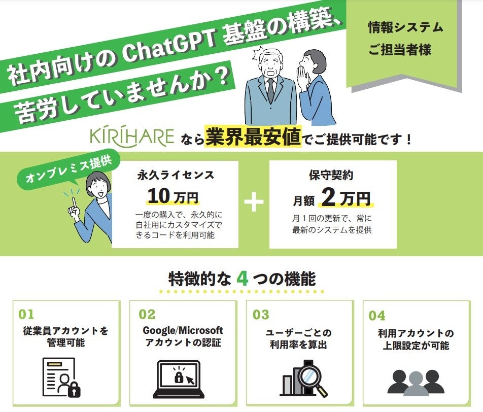 低価格で、AI活用による業務工数の削減や社内向けのChatGPT基盤構築を実現します。