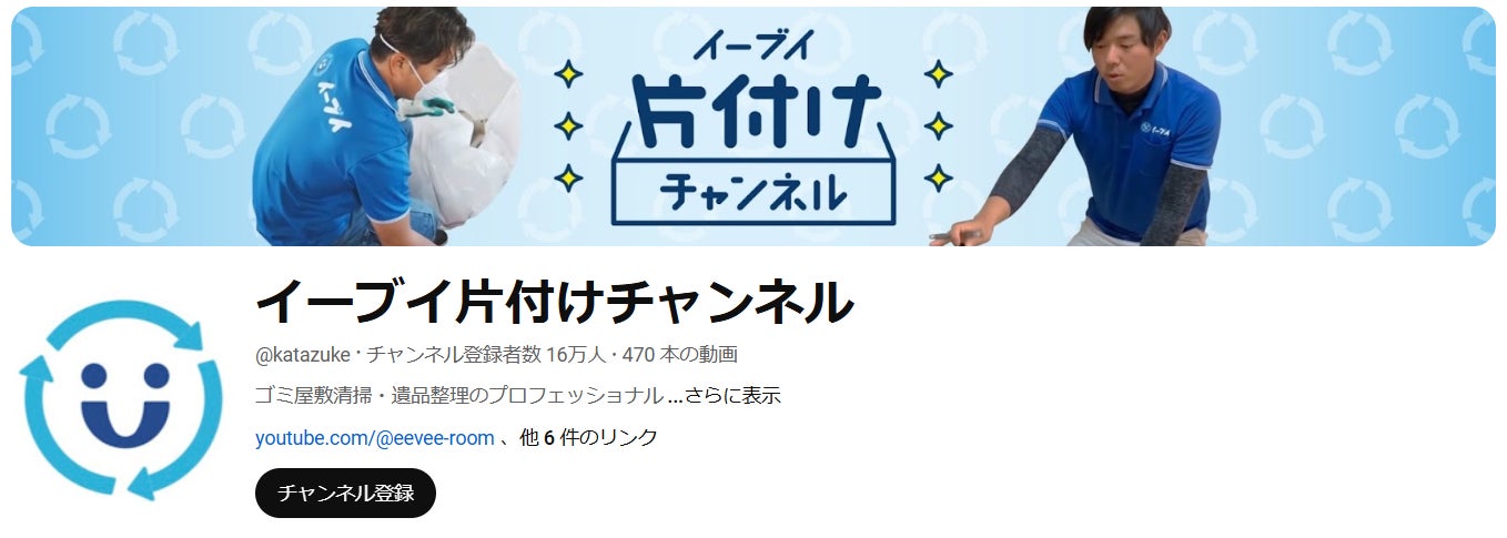 イーブイ片付けチャンネルは、登録者数16万人、総再生数7,500万回を突破しているYouTubeチャンネルです。大阪市の清掃業者「イーブイ」が運営しており、ゴミ屋敷や遺品整理など、いまや社会問題となっている片付けについて日々の現場からリアルを発信しています。
