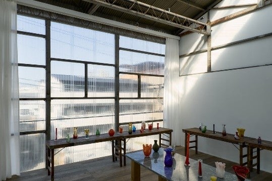 錆色の大きな扉と波板が目を惹く建物は、資材置き場として使われていた古い倉庫で、扉を開くと雑多な倉庫のイメージとは相見えない凛とした和空間が混在する異空間が広がります。天然鞍馬石でしつらえた迫力あるフラワーディスプレイは、和室の床の間に見立てました。店内中央のカフェスペースは、大理石とアクリル天板の迫力ある大テーブルを設えました。店舗二階はアトリエです。季節に合わせた花を用いたワークショップを不定期に開催しています。撮影、ギャラリーやイベント、ポップアップスペース等、様々な用途として貸出しも可能です。