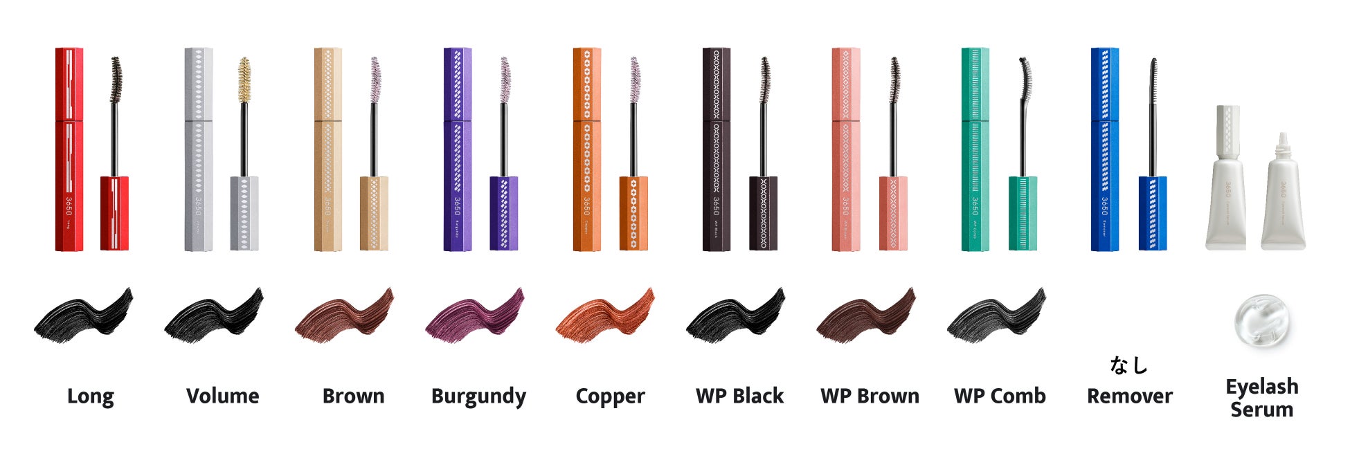 そしてこの度第二弾として、なりたい “美ロング”が見つかる全8種のマスカラに、オフ&ケアのアイテムを加えた全10種の『3650 マスカラ』が登場します。まつげを美しく長く見せるべく、処方、ブラシ、容器構造などあらゆる細部を独自技術で開発。そのうえで、ナチュラルなお湯オフタイプや、上向きカールが持続するウォータープルーフ、束感マスカラなど、好みやシーンに合わせて選べるラインナップを展開します。