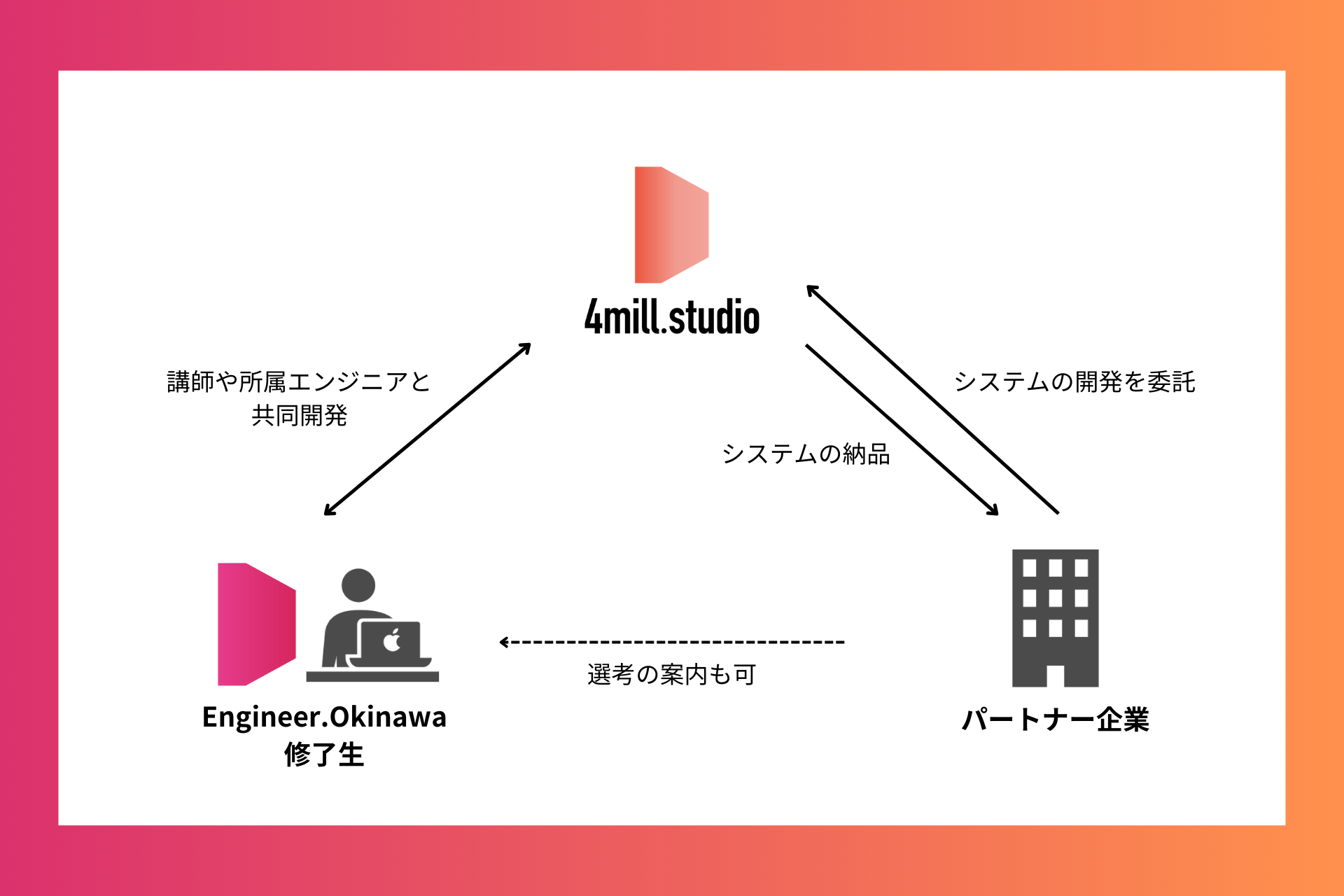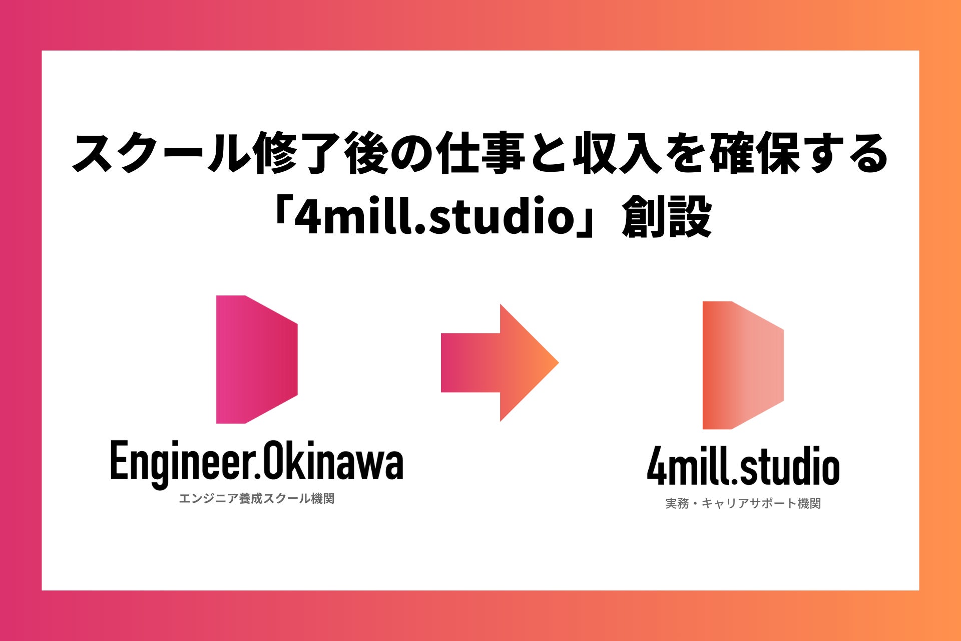 沖縄が抱える「地理的な制約」「教育の機会の不均衡」「県民所得の低さ」などの社会課題を解決するため、オンラインに特化したエンジニア養成所『Engineer.Okinawa』をはじめ、企業のシステム開発の経験を積みながら年収400万円まで稼ぐことを目指す受託開発事業『4mill.studio』を提供し、すべての人が最新のテクノロジーを学ぶ機会を手に入れ、地方社会をより豊かにする人材や事業を創出する世の中を目指しています。