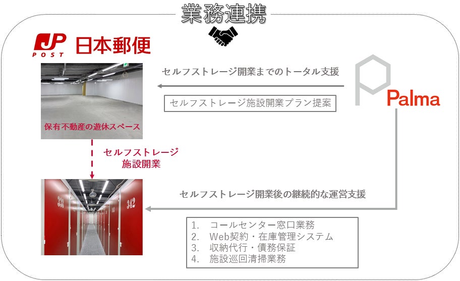 セルフストレージ(トランクルーム等のレンタル収納スペース)業界のプラットフォームとしてBPOサービス・施設開発事業を展開する株式会社パルマは、2018年に日本郵政キャピタル株式会社による当社への出資を機に、同社が属する日本郵便グループ会社との業務連携を検討しておりましたが、今般、日本郵政のグループ企業である日本郵便株式会社(以下「日本郵便」という)が福岡県の郵便局で試行するセルフストレージ事業について、当社のセルフストレージ関連のサービス(以下「本取引」という)を提供することを目的とした契約を日本郵便と本日締結致しましたので、お知らせ致します。