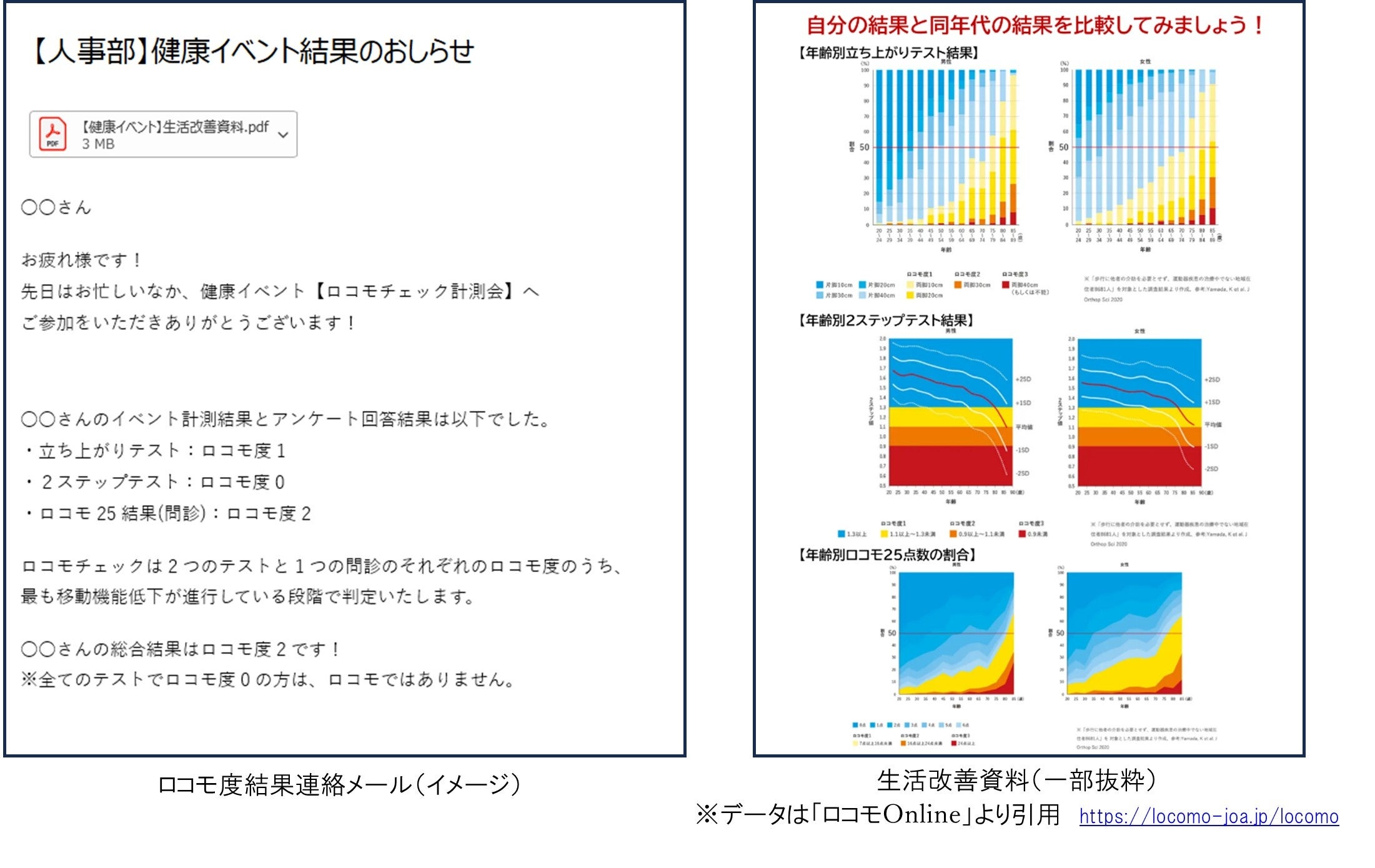 ※運動器の障害のために移動機能の低下をきたした状態をロコモティブシンドロームといいます。「立ち上がりテスト、2ステップテスト、ロコモ25(WEB問診)」の 3つのテストで運動器の状態をチェック。計測後のアンケート回答に基づき「ロコモ度」を判定。