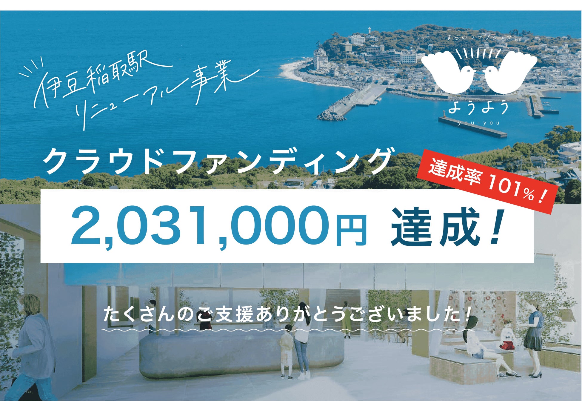 伊豆稲取駅リニューアルプロジェクトを進めるにあたり、開業記念商品の開発や施設内設備への投資等のための資金を集めるために実施したクラウドファンディングにて、目標金額200万円を達成しました。結果、184名の方々から支援総額2,031,000円をご支援いただきました。たくさんのご支援誠にありがとうございます。