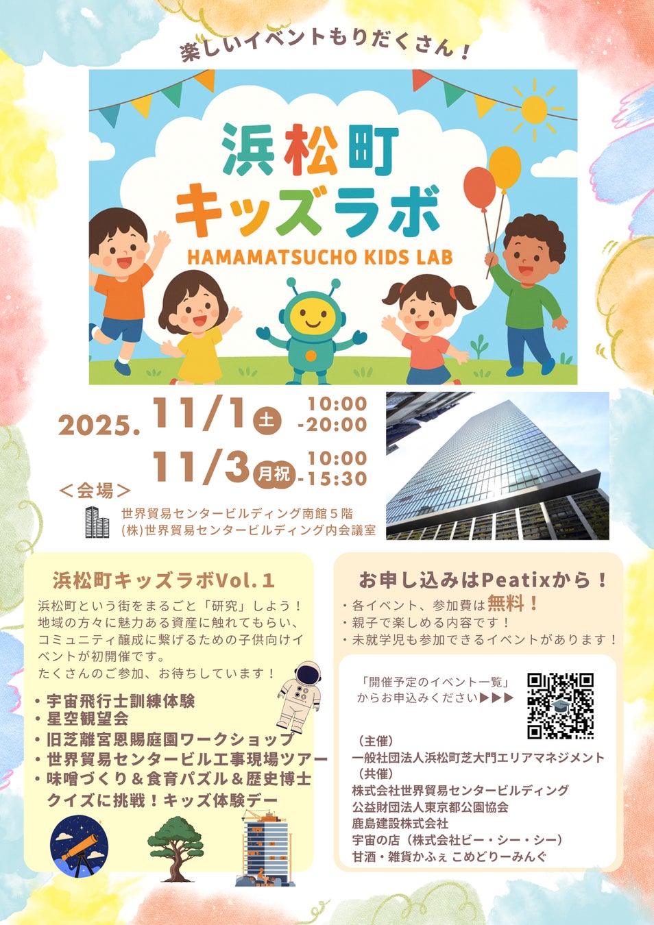 株式会社世界貿易センタービルディング(本社:東京都港区、代表取締役社長:宮﨑親男、以下「WTC」)および株式会社貿易ビルサービス(本社:東京都港区、代表取締役社長:宮﨑親男)が運営する、一般社団法人浜松町芝大門エリアマネジメント(本社:東京都港区、代表理事:鈴木達人、以下「当法人」)は、浜松町エリアの魅力を子どもたちとともに体験する新企画「浜松町キッズラボ」を2025年11月1日(土)および3日(月・祝)に初開催します。