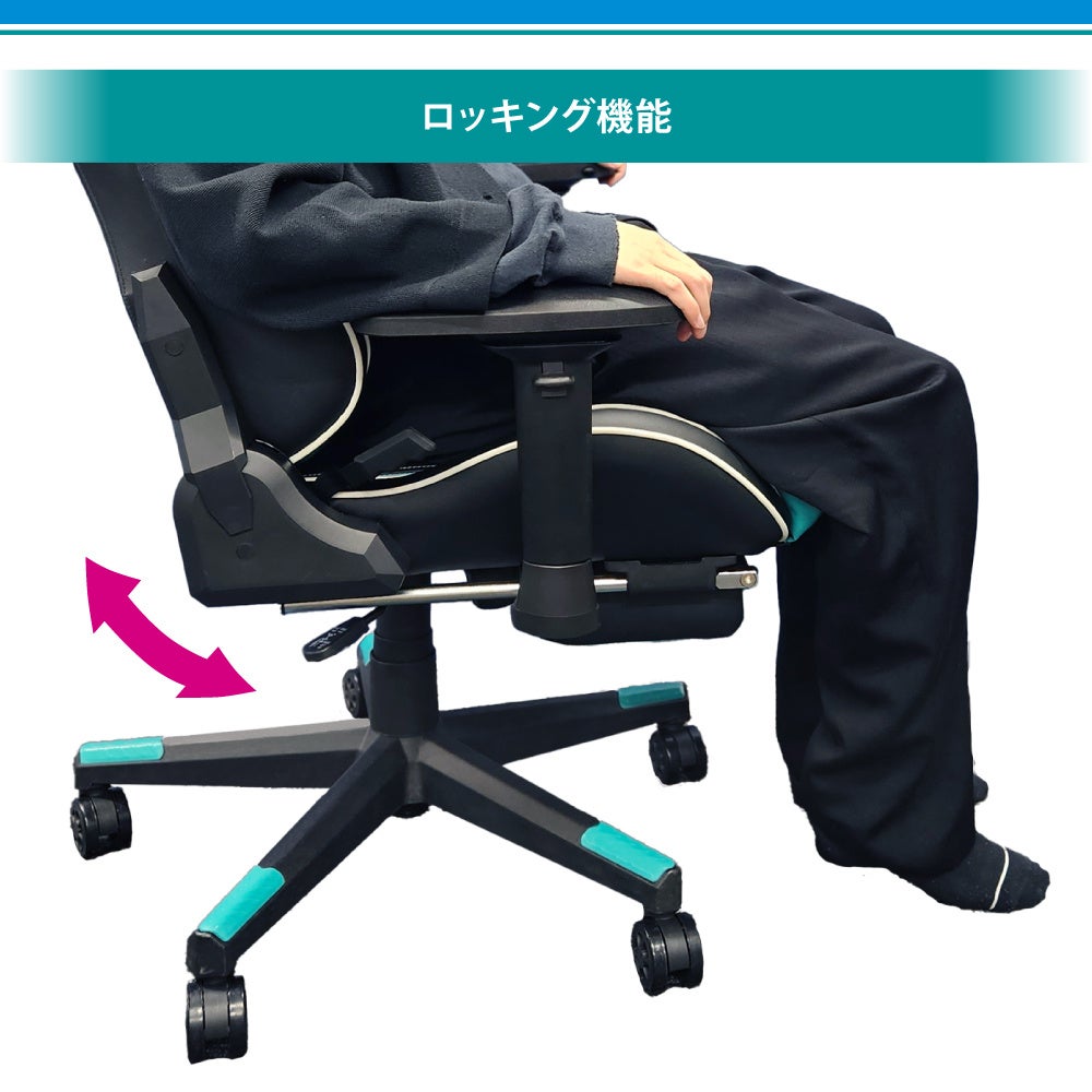 ロッキング機能は、背クッションと座面がゆりかごのように揺れ動くことで、座る時の反動や姿勢を変えた際の衝撃を吸収する機能です。この機能により身体への負担を低減し、座り心地を良くすることで長時間のゲームプレイでも疲れにくくなる効果があります。※ロッキングの強度調節と、ON/OFF が可能です