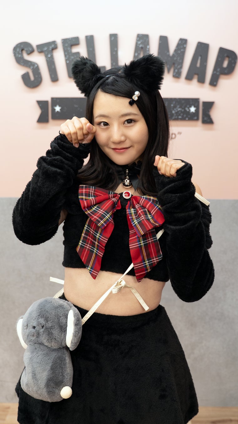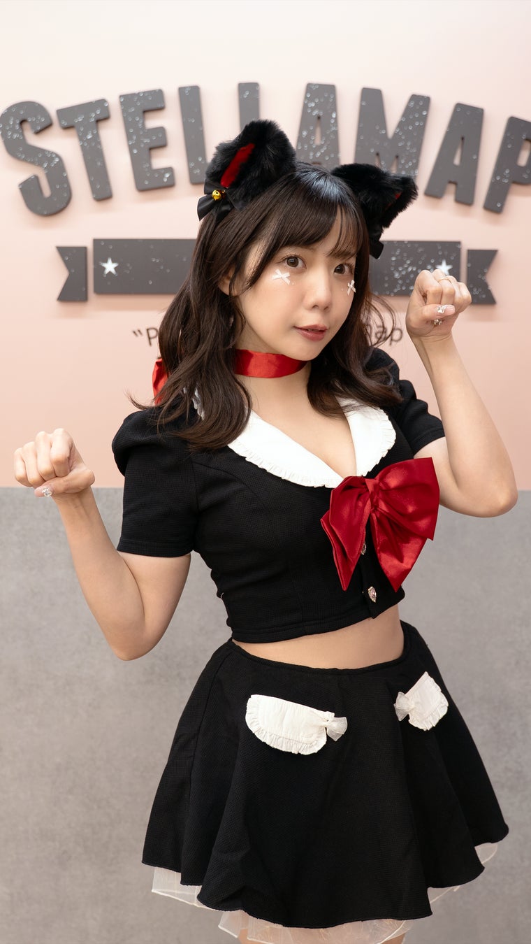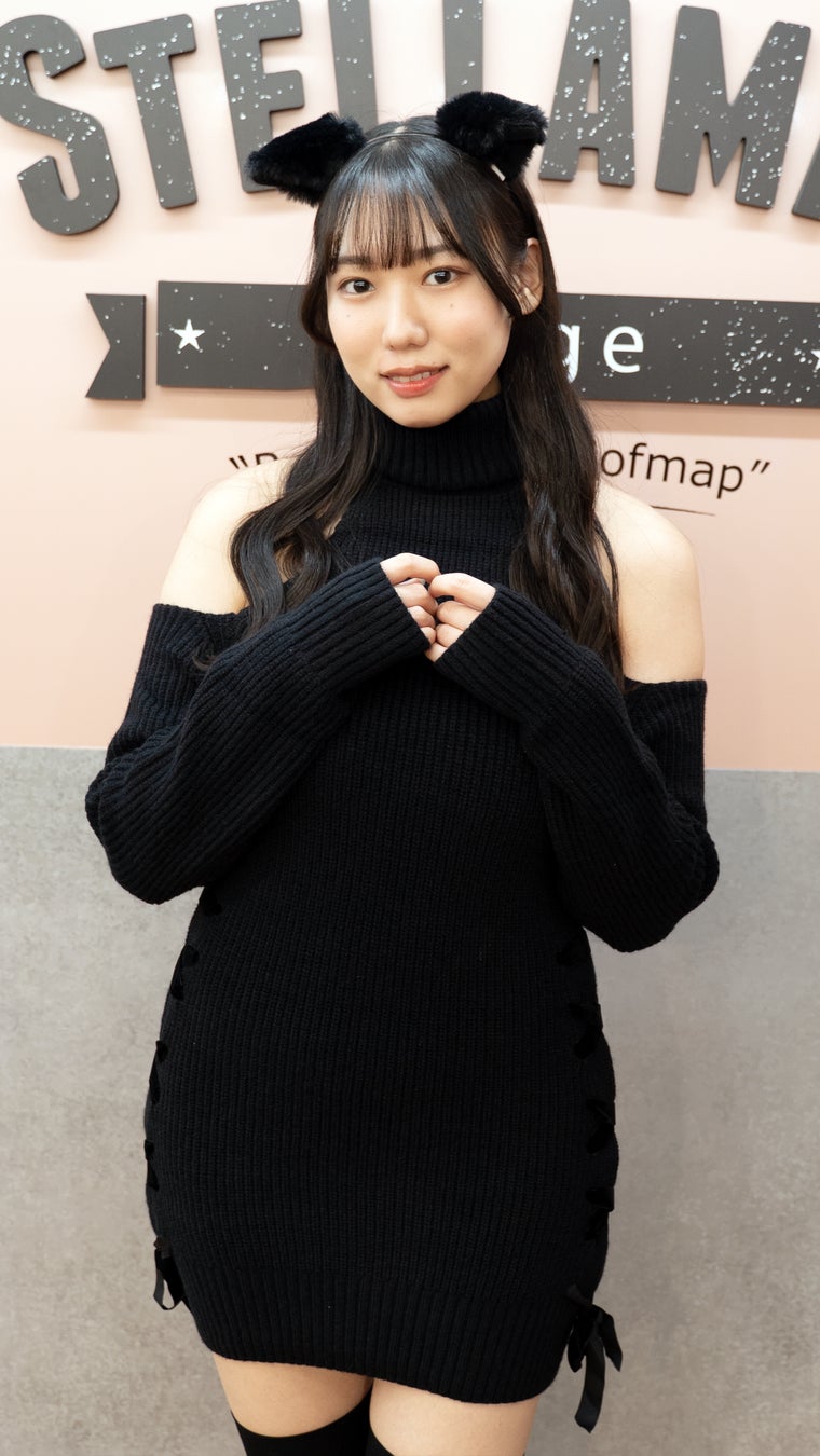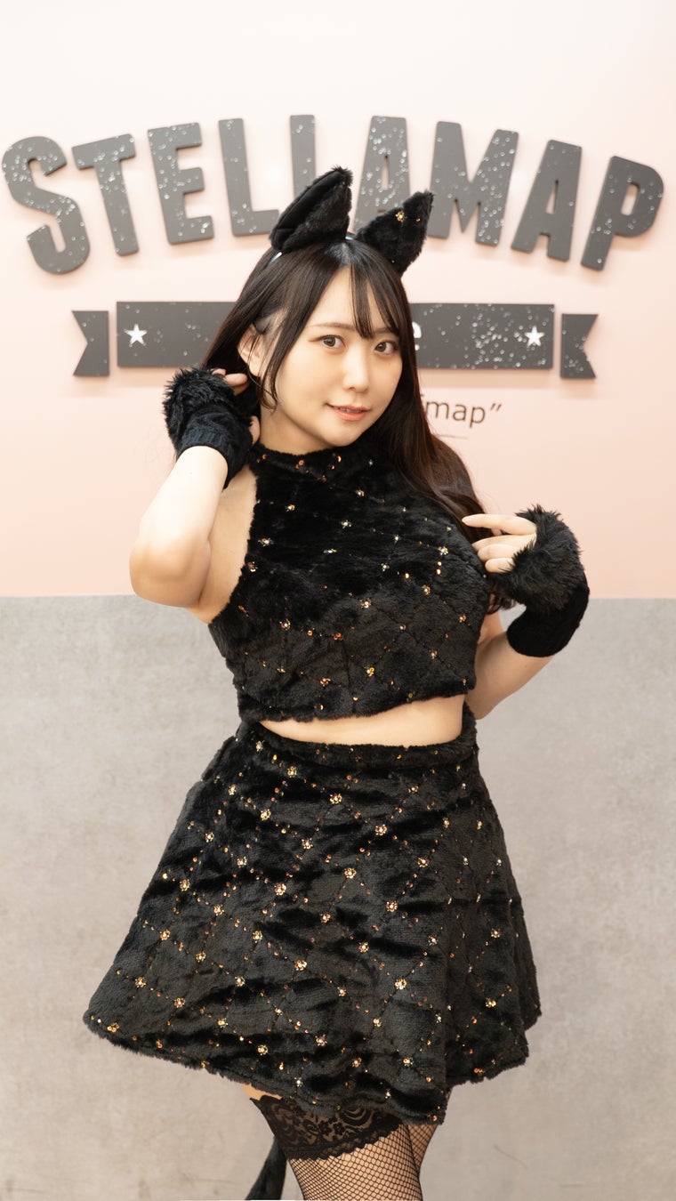 「今回は黒を基調とした衣装で、可愛らしさの中にも落ち着いた雰囲気を意識しました。ふわふわの猫耳と、肩の見えるニットワンピースの組み合わせで、柔らかさと大人っぽさのバランスを楽しんでいただけると思います!」