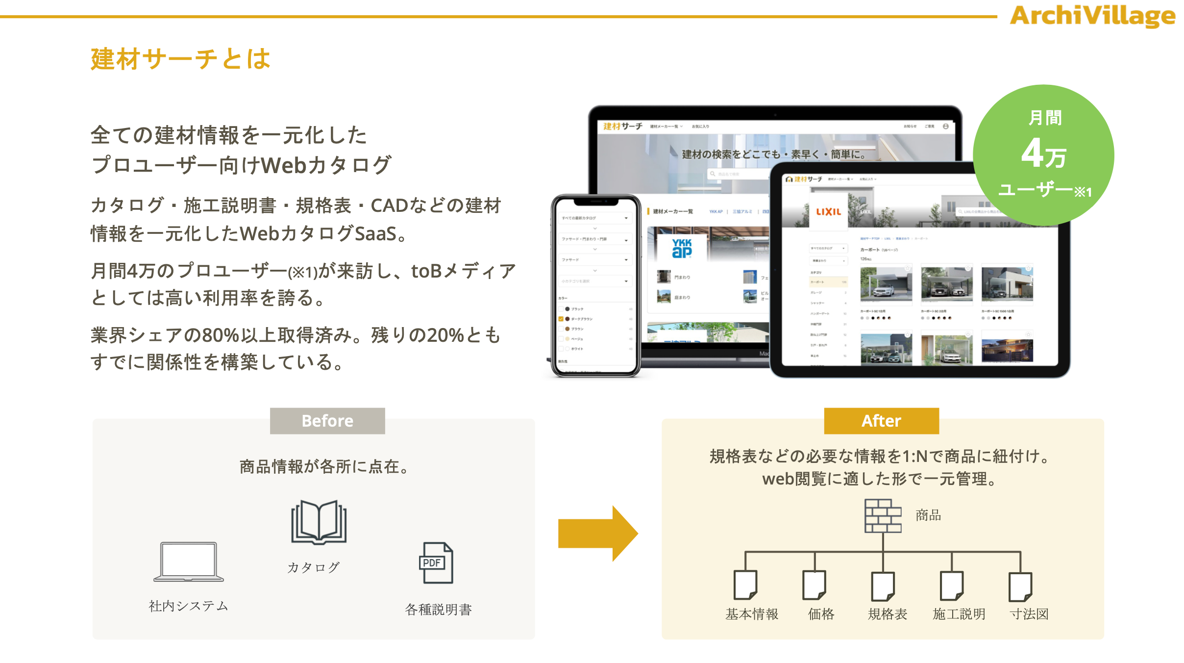 Archi Villageは、「全ての居住環境を快適で安全な空間に」をミッションに掲げ、建材情報のハブとして、建材ワークフローに変革を起こします。建材情報の総合プラットフォーム「建材サーチ」の運営を通し、あらゆる建材情報をまとめ、建材業界全体の非効率を解消し、より早く、より良い建材商品を探せる社会を実現します。