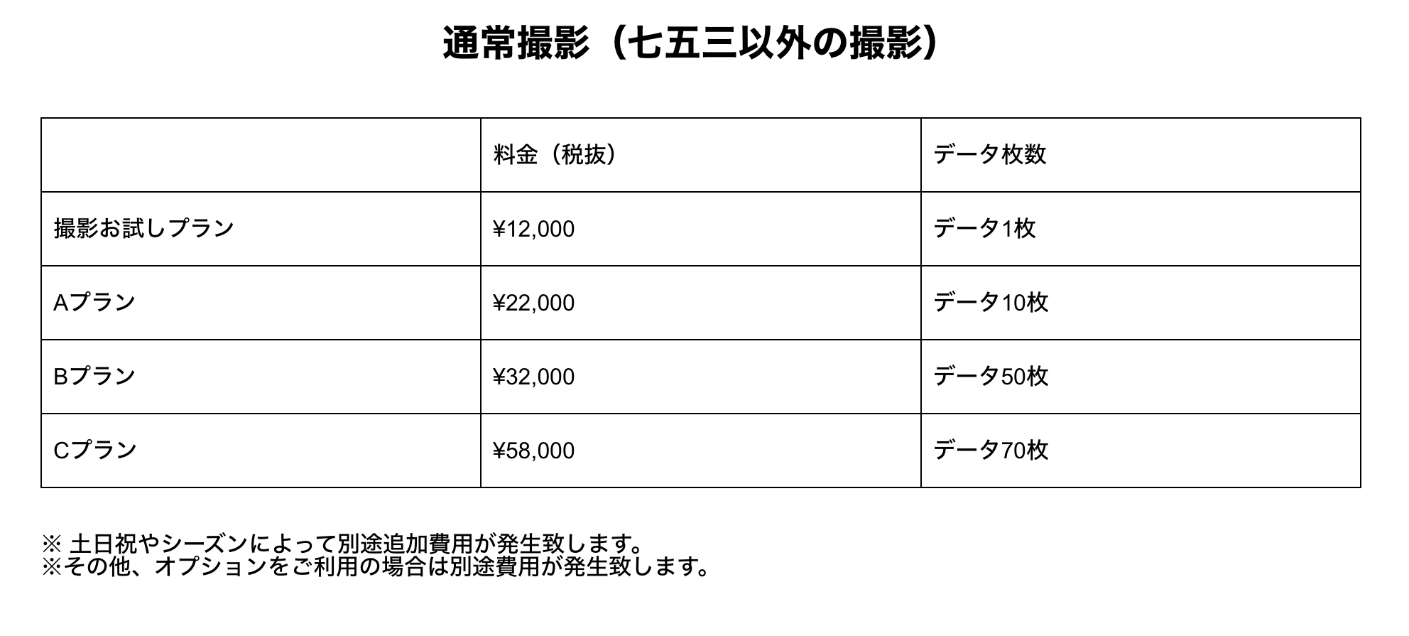 当スタジオでは、主にお子様の撮影を中心に、七五三、バースデー、入園・入学、家族写真など、様々なシーンに対応した撮影プランをご用意しています。