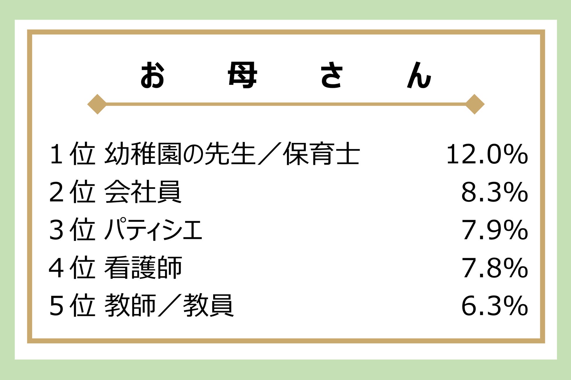 お母さんのランキングでは、「幼稚園の先生/保育士」が1位(12.0%)!アンケートに回答いただいたお母さんの平均年齢は45歳で、ちょうど第1回調査の頃に小学生の年代です。1989年に実施した第1回「大人になったらなりたいもの」調査でも「保育園・幼稚園の先生」は1位で、その後も長きにわたり上位にランクインする人気の職業です。