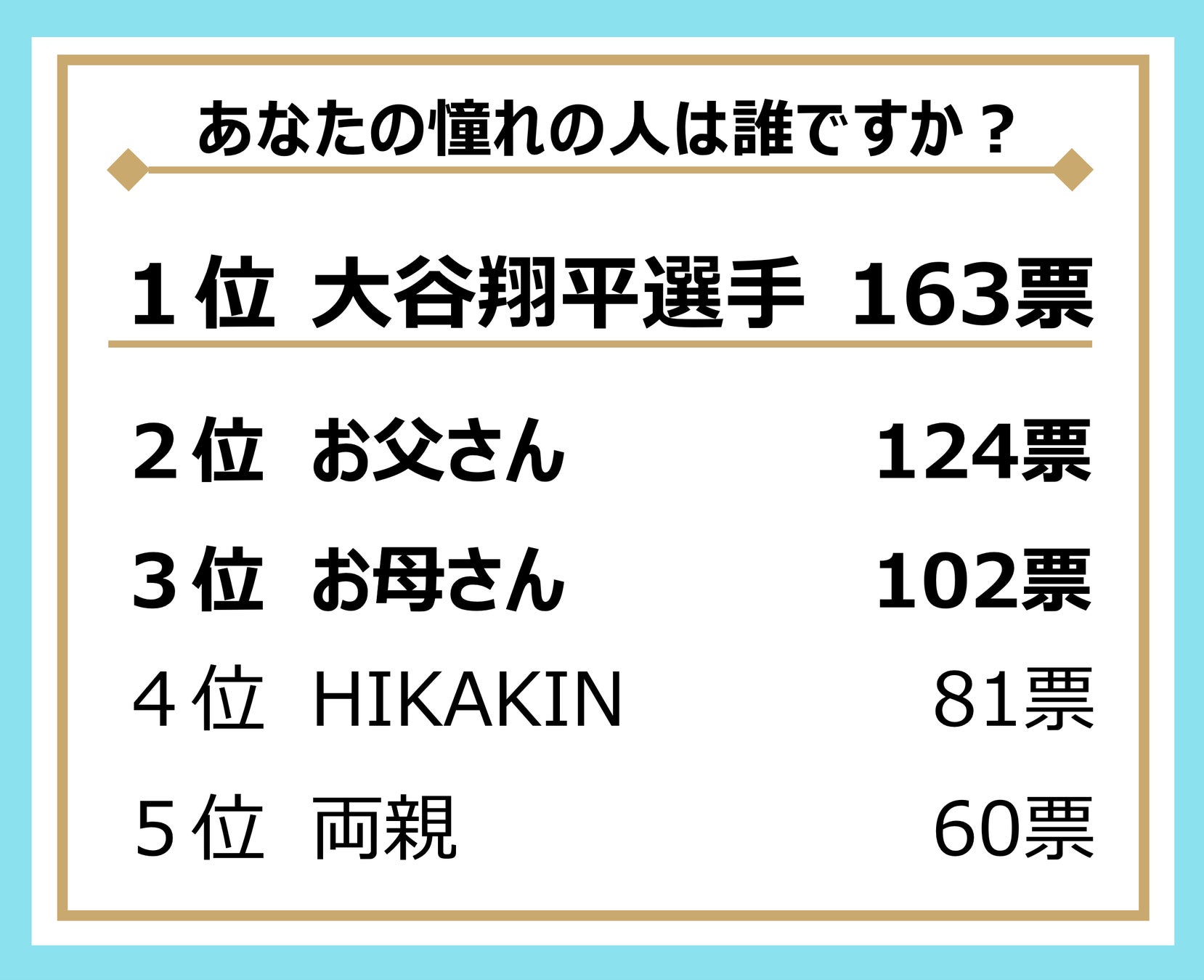 子どもたちに憧れの人を聞いたところ、メジャーリーグのロサンゼルス・ドジャースで活躍する「大谷翔平選手」が個人としてダントツの163票を獲得し第1位でした!特に、男女や年齢を問わず名前が挙がったのが特徴です。属性別に分類してみると、野球選手・サッカー選手を中心に全体的にもスポーツ選手の名前が多く挙がりました。