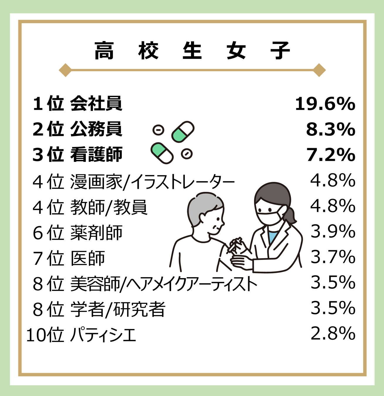高校生女子の「なりたい理由」では、「好きだから」「人の役に立ちたいから」「収入が良さそうだから」の順に優先度が高い結果であり、「看護師」も働く場所や時間の選択肢が広がれば引き続き人気の職業となりそうです。