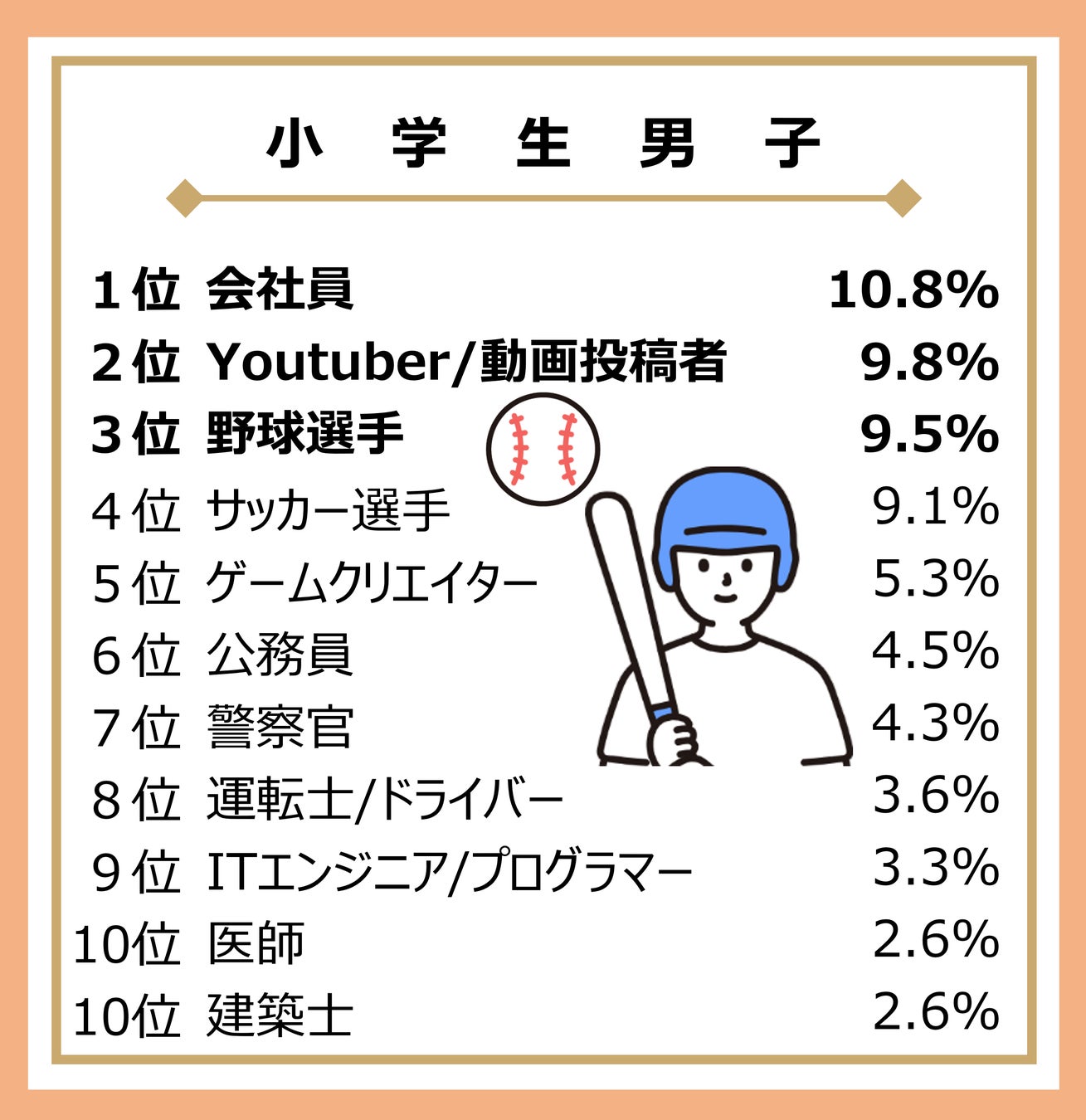 小学生男子のランキングでは、「サッカー選手」人気を逆転し「野球選手」が3位(9.5%)にランクインしました!1989年の調査開始以降、男の子のランキングでは「野球選手」「サッカー選手」「学者・博士」が長きにわたりトップ3を争っていました[1]が、2020年にインターネット調査へ移行してから「野球選手」がベスト3に入ったのは今回が初めてです。今回の調査で子どもたちに「憧れの人」を聞いたところ、第1位だった大谷翔平選手をはじめプロ野球選手は最も多い35名の名前が挙がりました。応援する球団の選手をはじめ、メジャーリーグでの活躍が日々報じられる環境もあってか再び野球人気が高まっていることがうかがえます。
