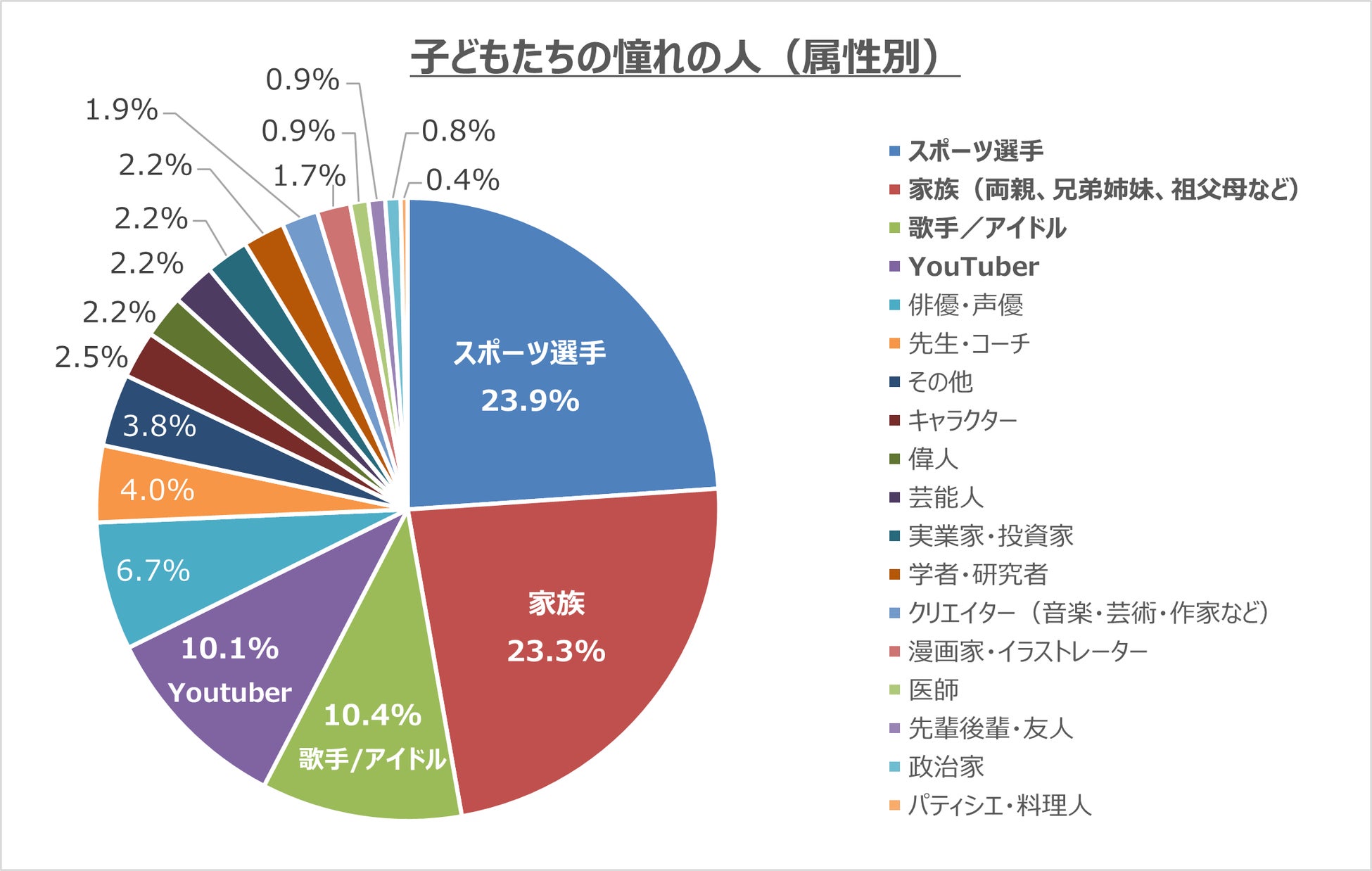 また、両親や祖父母、兄弟姉妹など身近な家族を挙げる人も多く、2022年の調査[4]でも述べた通り、お父さんお母さんが仕事や家事をする姿を子どもたちがしっかりと見ていることがわかります。そして、第4位にランクインした「HIKAKIN」をはじめ、ゲーム実況や歌い手などYouTuberを挙げる人も多く、子どもの頃からSNSが身近なα世代の特徴がよく表れた結果となりました。
