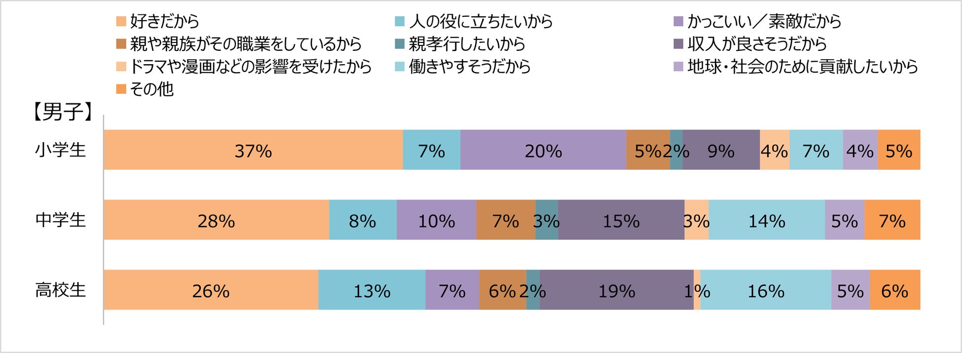 初めて、高校生男子のランキングで「社長/起業家」が6位(3.5%)にランクインしました!第一生命経済研究所・西野研究員のコメントにもある「アントレプレナーシップ教育[2]」は、人生100年時代において、自分らしいキャリアを構築していくために「社会の課題を見つけ、解決する力」や「夢中になれることを仕事にする力」を習得することを目的としています。「Q2.あなたが<Q1.で選んだ職業>になりたい理由を教えてください。」の問いでも、全体で「好きだから」が最も多い結果となりました。高校生では「収入が良さそうだから」「働きやすそうだから」の割合が増えますが、若い起業家がYoutube等のSNSで身近なα世代は、自分の好きなことや夢中になれることを仕事にするのが当たり前になっていくのかもしれません。