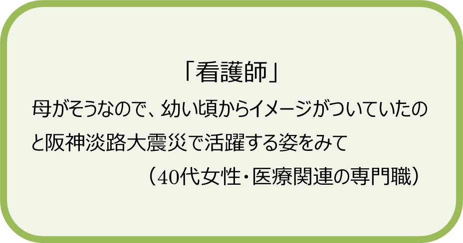 また、「看護師」と回答した人の中には、現在実際に医療関係の仕事に就いている方もおり、そのお子さんもお母さんに憧れて「看護師」を志している、と回答されていました。身近なお父さん・お母さんの働く姿を、子どもたちがしっかりと見つめていることがよく分かるエピソードだと思います。