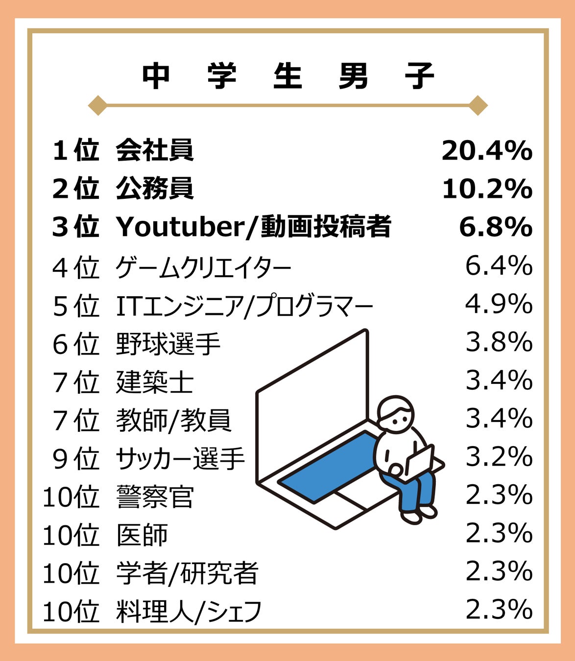 中学生男子のランキングでは「Youtuber/動画投稿者」「ゲームクリエイター」「ITエンジニア/プログラマー」とデジタルネイティブな世代らしいIT関連の職業が上位に入りました。2020年4月にプログラミングの授業が必修になりましたが、最近では人気のものづくりゲーム「Minecraft(マインクラフト)」の教育版を授業に取り入れる学校もあるそうです。ブロックを組み合わせてオリジナルの世界を構築したり、素材を集めて建物や家具を作ったり創意工夫して楽しみながら学ぶことができるゲームで、7位(3.4%)に「建築士」が初めてランクインしたのはそのような背景も影響しているかもしれません。