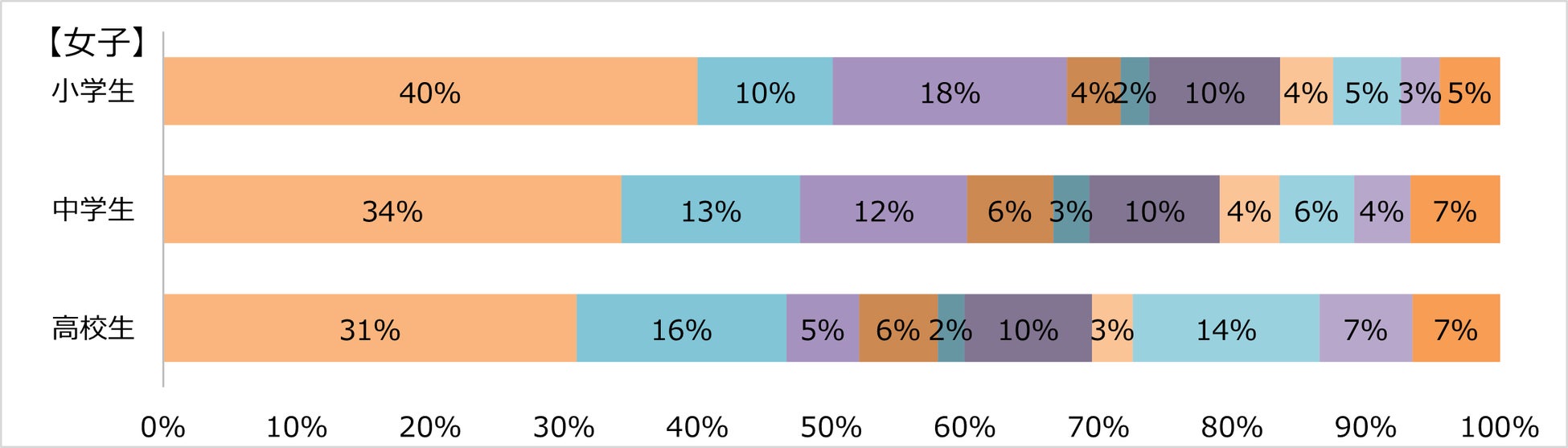 小学生女子のランキングでは、「歌手/アイドル」が5位(4.9%)と昨年の10位からランクアップして人気上昇中です。「憧れの人」でも男女問わずSnow ManやNiziUといったアイドルや、Ado、Mrs.GREEN APPLEなど歌手・アーティストの名前も多数挙がり、プロスポーツ選手、家族に次いで多い結果となりました。『推しの子』のキャラクターを挙げる人もおり、作品の影響力の大きさや、「推し活」が当たり前になっていることを実感します。
