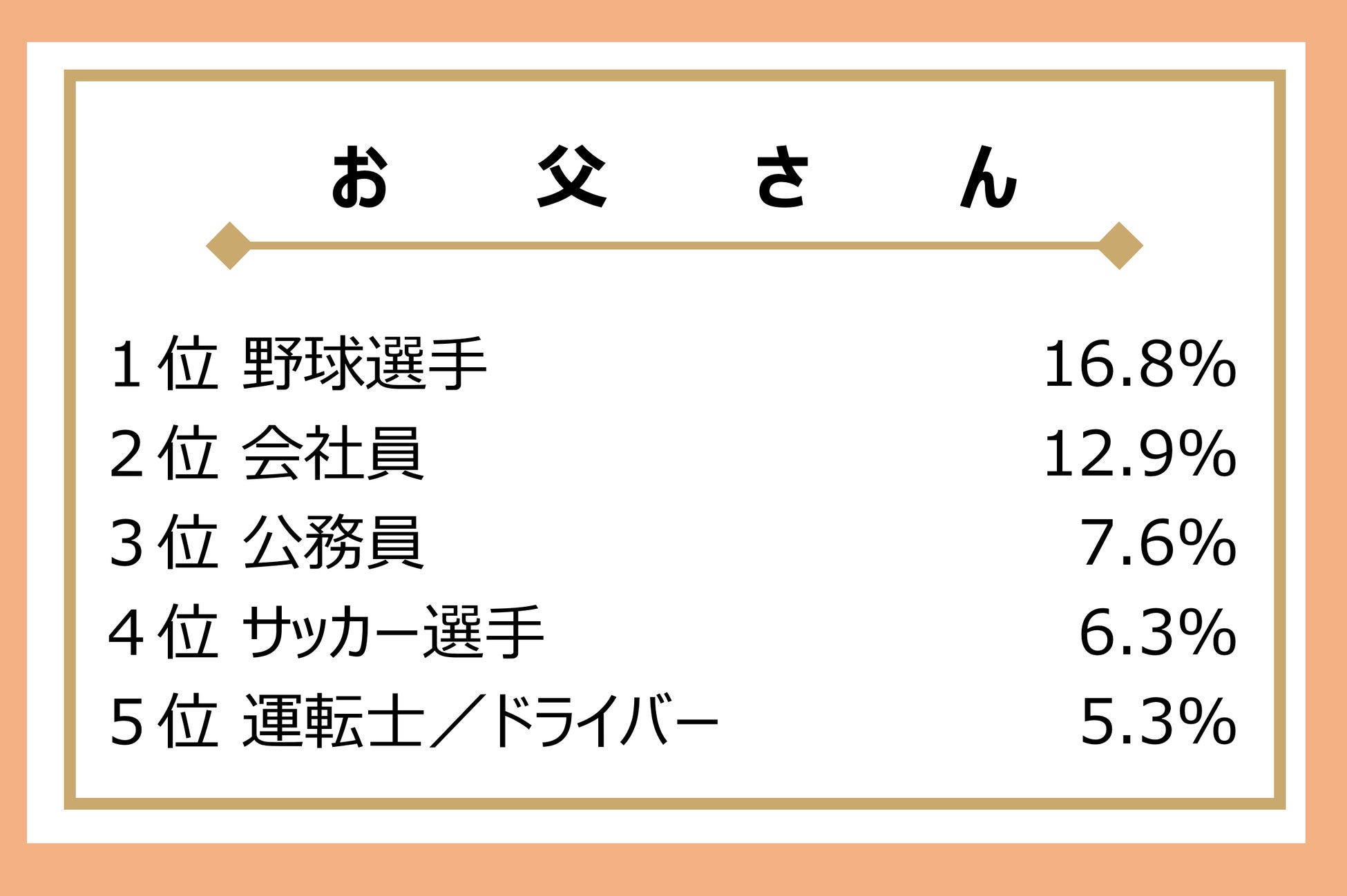 今回初めて、アンケートにご協力いただいた子どもたちのお父さん・お母さんにも子どもの頃に大人になったらなりたかったものを聞いてみました。お父さんのランキングでは、小学生のランキングでも3位となった「野球選手」が1位(16.8%)!少年野球のチームに所属していた人も多く、また毎日テレビ中継があり、王選手やイチロー選手をはじめそれぞれの世代のスター選手に憧れて、との声も多く集まりました。