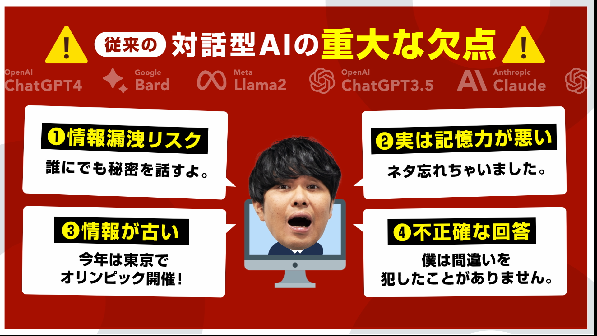 WEB広告では、さらば青春の光の東ブクロさんがスキャンダル(架空)により解雇が決定。その後、森田さんは従来の対話型AIと新たなコンビを組んでネタを披露し、順調に進んでいました。しかし、従来の対話AIが抱える問題点である記憶力の弱さや情報漏洩リスクの問題により、大きな困難に直面しました。そこで、AiBCを導入することで弱点を克服し、新しいコンビが成功するというユーモラスな広告が展開されています。