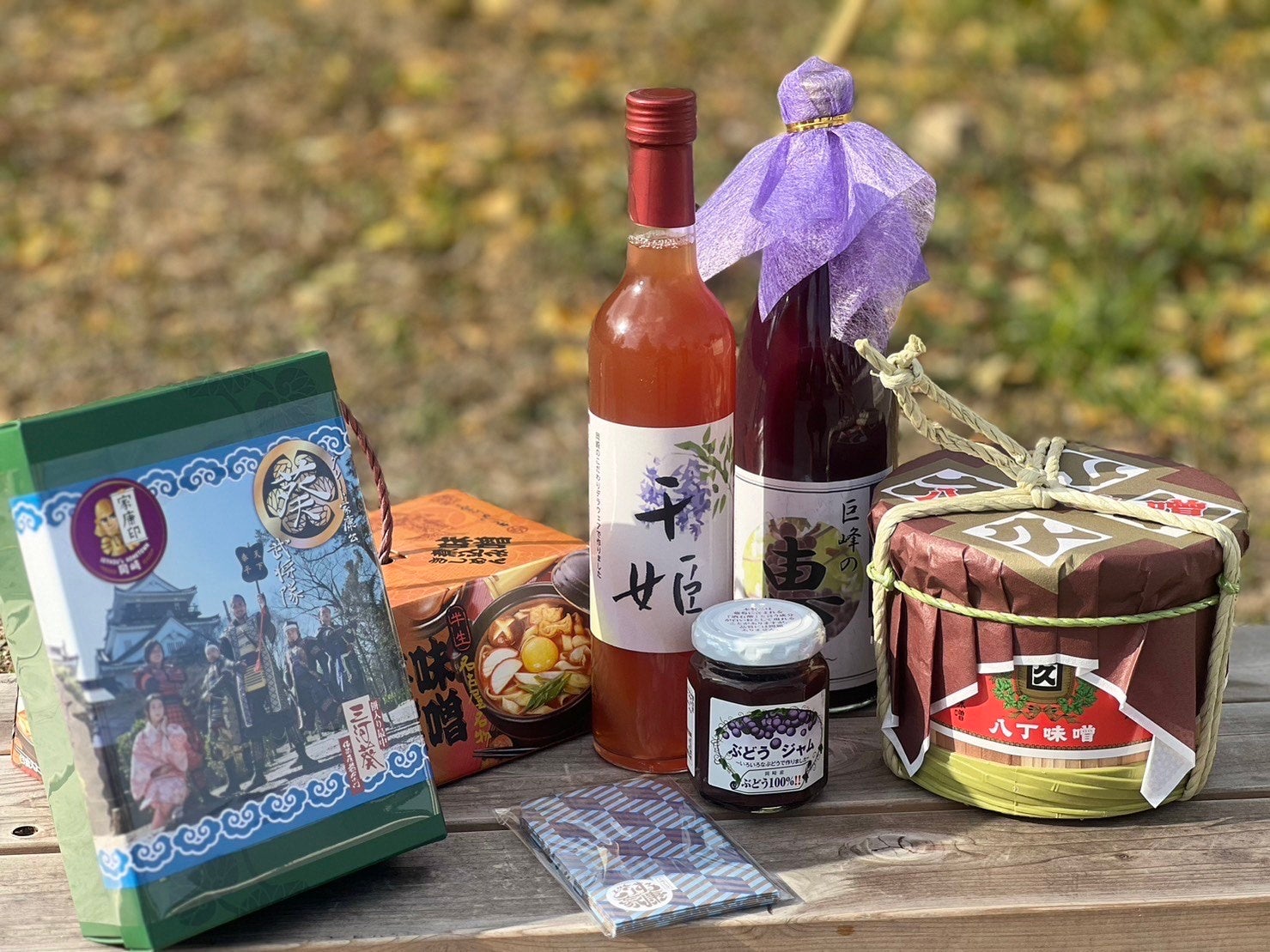 【特産品:八丁味噌、味噌煮込きしめん、岡崎のぶどうを使ったワイン・ジュース・ジャム、グレート家康公「葵」武将隊限定パッケージの三河葵(餅入りもなか)、松本潤さん監修のポチ袋】