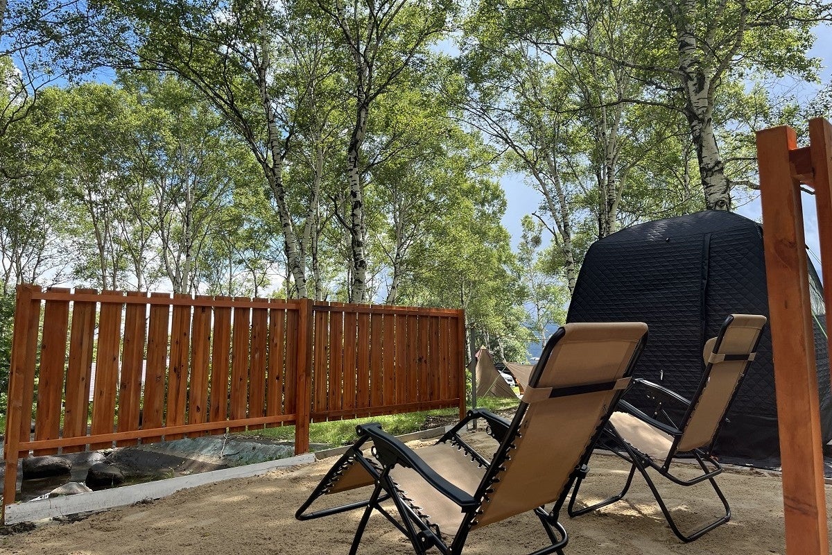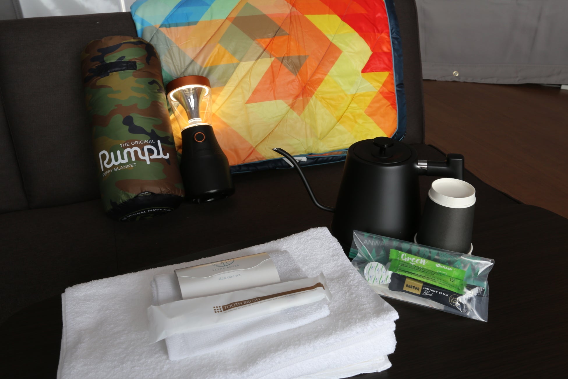 お部屋には寝具・アメニティ・BBQ道具まで完備。気軽にアウトドア体験を楽しめます。