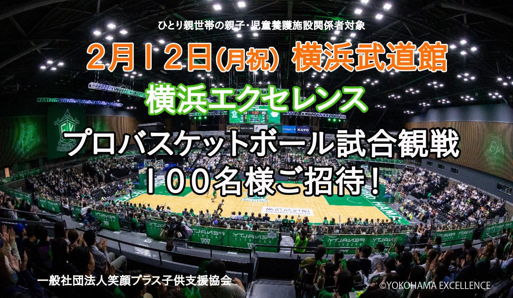 一般社団法人笑顔プラス子供支援協会(所在地:東京都港区、代表:加藤美佐子、以下:一社笑顔プラス子供支援協会)https://www.egaoplus.net/は、B3リーグ所属プロバスケットボールクラブ横浜エクセレンス様よりご協賛いただき、ひとり親世帯の親子他を対象とした2月12日(月祝)15時から横浜武道館にて開催される『横浜エクセレンス vs さいたまブロンコス』の試合観戦にひとり親世帯の親子他100名様ご招待致します。