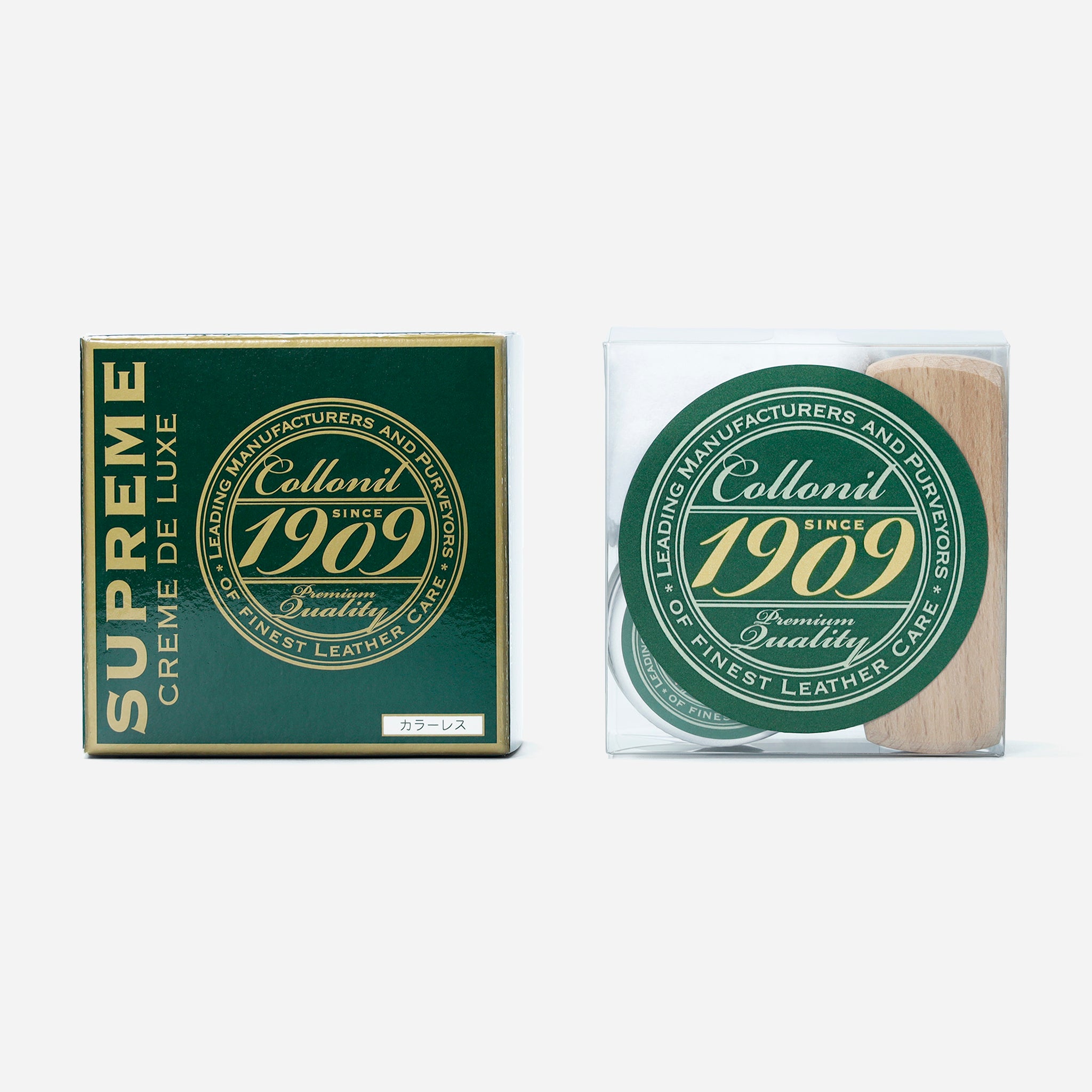 コロニルを代表する人気商品1909シュプリームクリームデラックスのミニサイズをはじめ、馬毛と豚毛の2種類のブラシ、そしてポリッシングクロスをセットにしました。ブラシは柄にコロニルのロゴを印刷した、セット限定デザインです。歴史あるブランドならではのレトロな広告イラストをあしらった缶入りのパッケージは、お手入れ道具の収納ケースとしてもご活用いただけます。