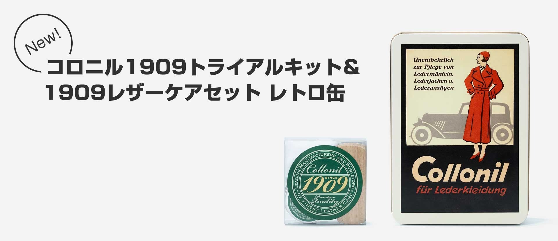 「コロニル1909トライアルキット」と「1909レザーケアセット レトロ缶」の2品が同時発売いたします。どちらのセットも、コロニルを代表する人気商品1909シュプリームクリームデラックスのミニサイズを中心に、コロニルらしい革が喜ぶ上質なレザーケアを楽しめる内容に仕上がっています。