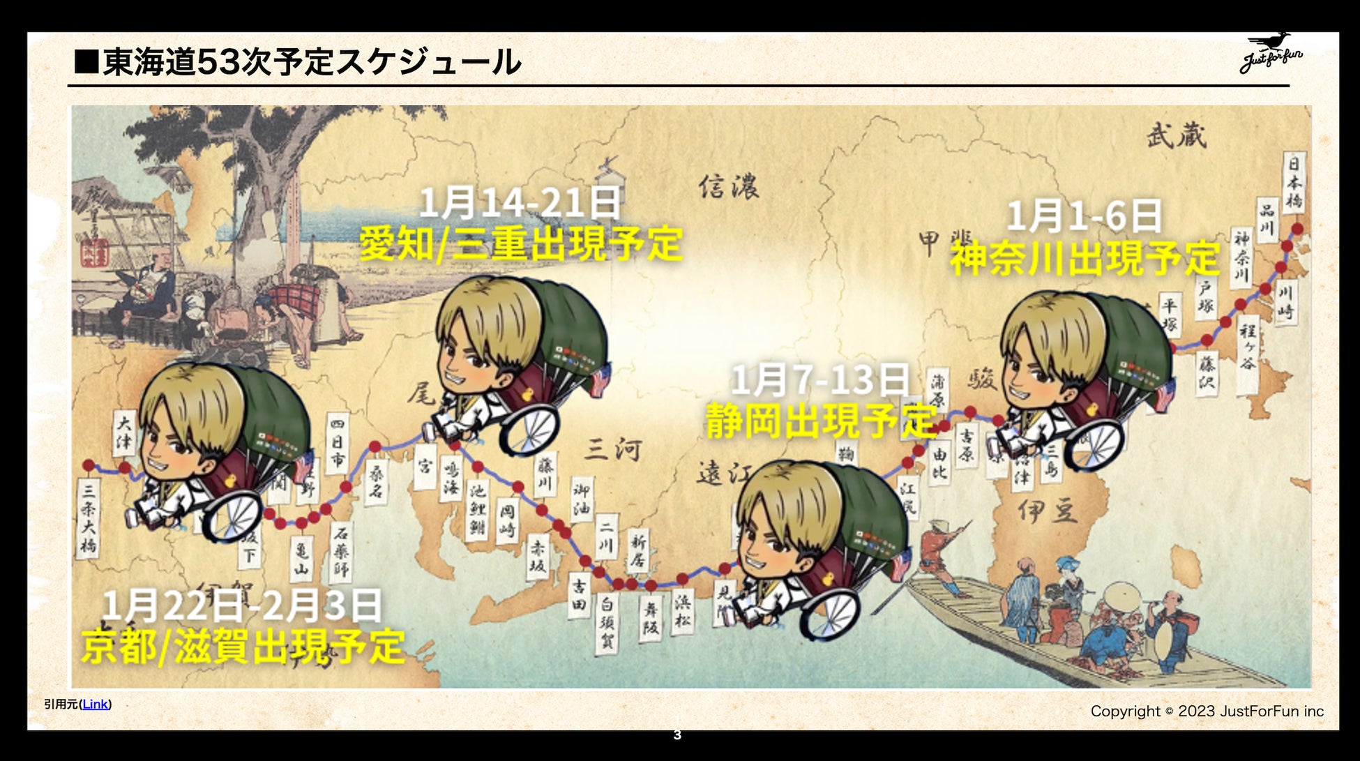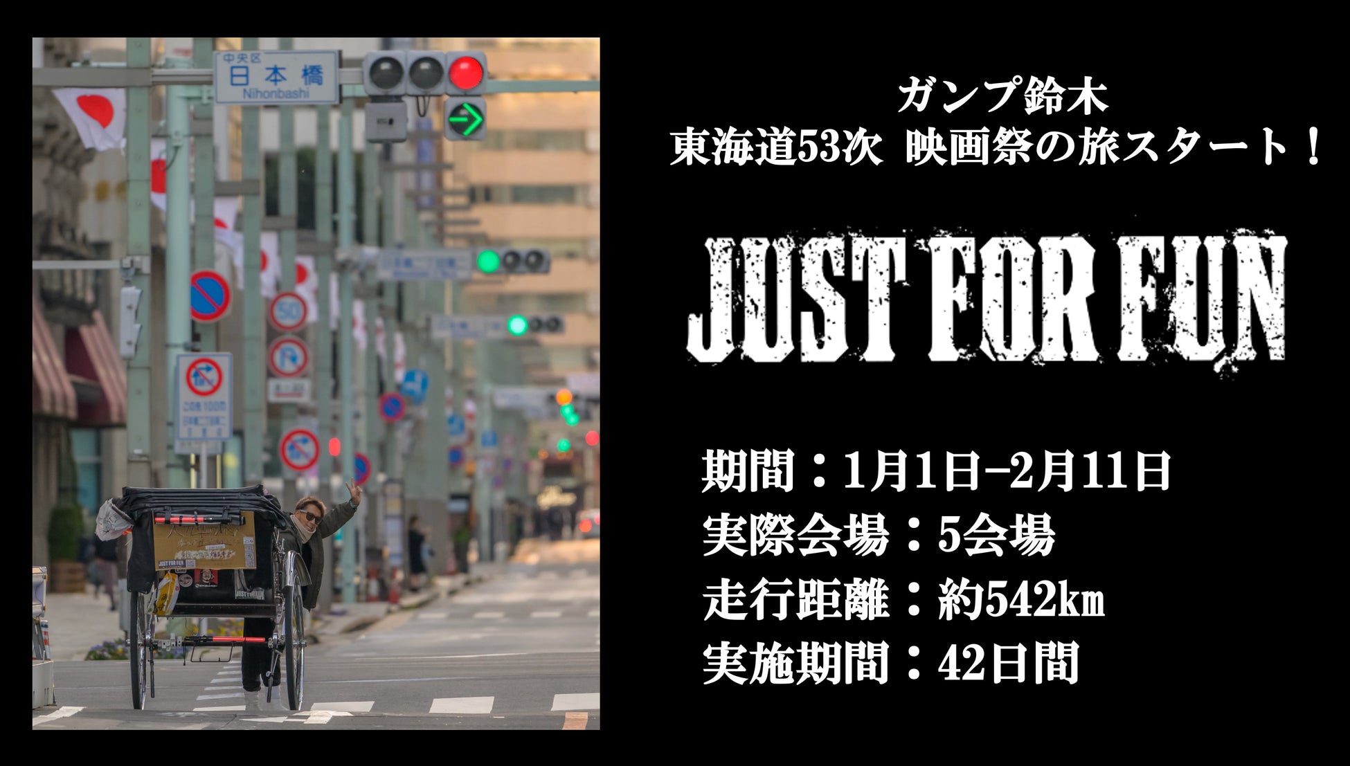 人力車で世界を走るガンプ鈴木は、今回、1月1日〜2月11日に自身のドキュメンタリー映画「JUST FOR FUN – 一期一会。人生を走り続ける男の物語。」東海道での公開に際して東海道53次映画祭の旅をスタートしました。今回の映画祭は『静岡・愛知(2会場)・京都・大阪』の全5会場で上映されます。
