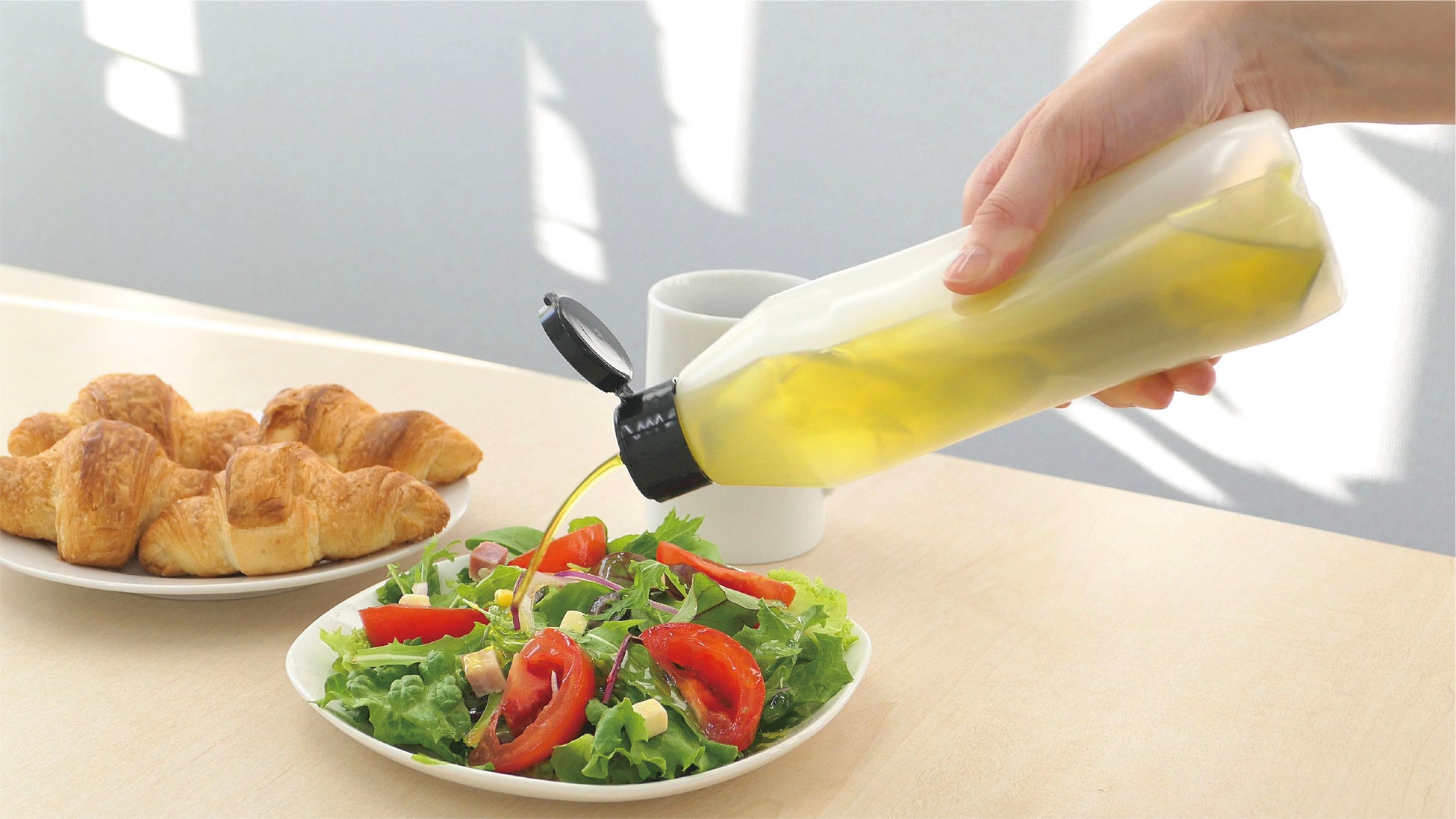 使用後に分別できる独自構造により、PET資源の循環利用を目指した二重容器です。ガスバリア性に優れる内容器によって、容器全体の重量を削減できます。また、80%以上を占める外容器は内容物に触れないPETのため、クリーンな資源になります。引き抜いた後の内容器はとても薄く、粘度の高い内容物も簡単に最後まで使い切ることができます。