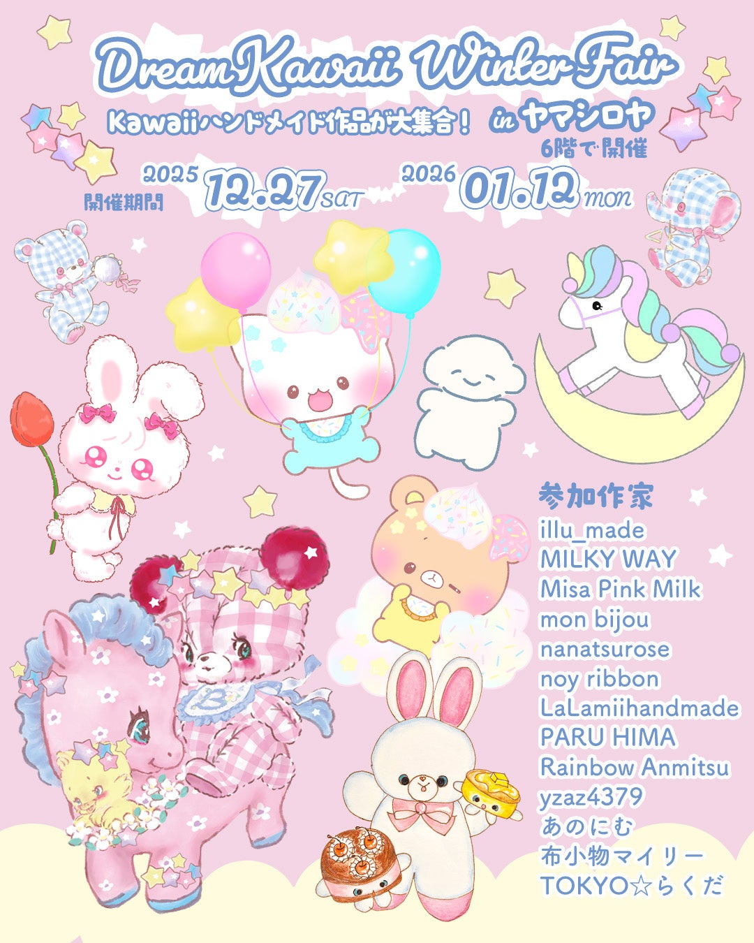 ファンシー雑貨商品の企画・販売・イベント運営を行うユーモアラボ株式会社(所在地:東京都豊島区・代表:皆元 舞)は「ゆめかわ」をテーマにしたハンドメイドのオリジナルグッズが一堂に揃うPOP UPイベント『Dream Kawaii Winter Fair』を、2025年12月27日(土)より上野ヤマシロヤ6階にて開催いたします。