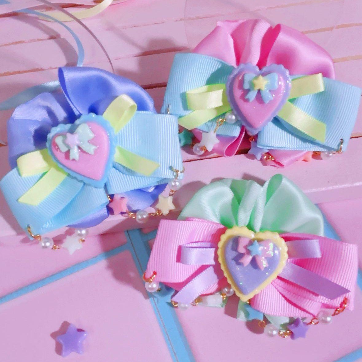 粘土、リボンなどの異素材を組み合わせたPOPなヘアアクセサリーです!パステルカラーで彩られたゆめかわファッションのマストアイテムです!