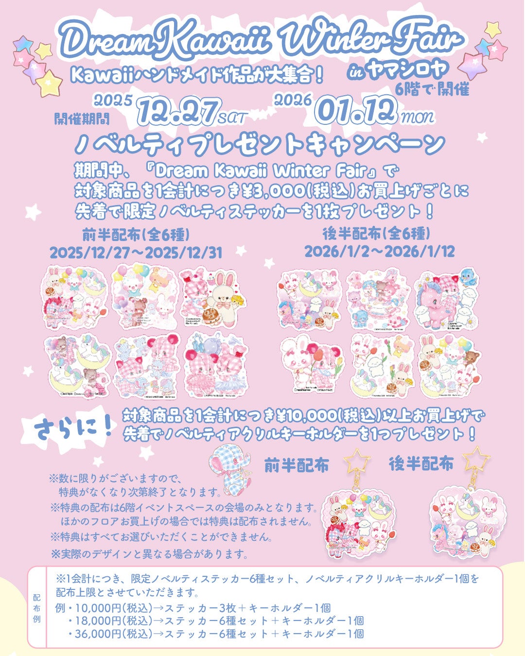期間中、『Dream Kawaii Winter Fair』で、対象商品を1会計につき3,000円(税込)お買上げごとに、先着で限定ノベルティステッカーを1枚プレゼントいたします。