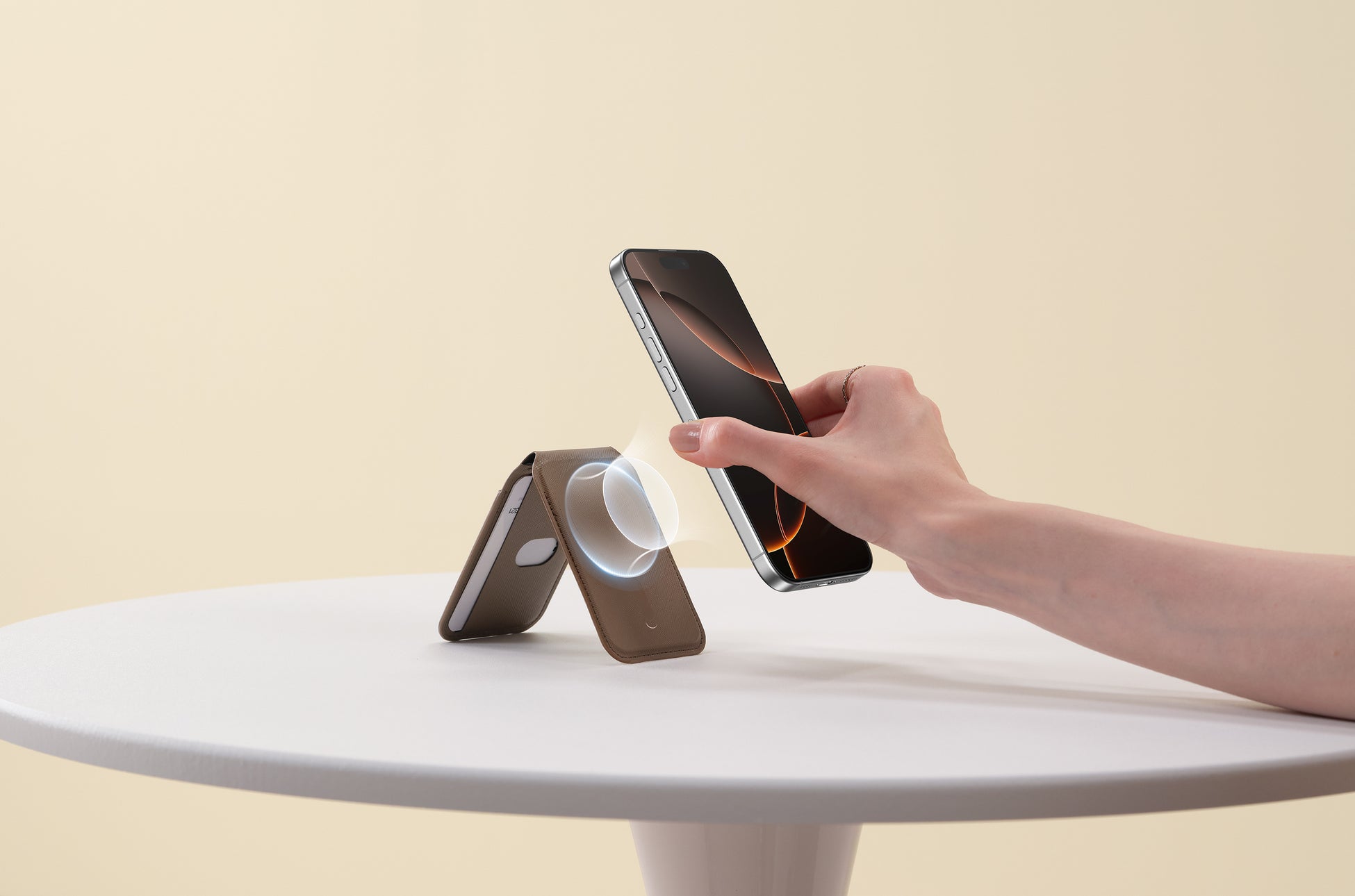 MagSafe対応のこのウォレットは、他のマグネット式ウォレットの4倍以上を誇る3,200g の磁⼒を備えています(3,200 g ≈ iPhone 16 Pro Max 14台分)。