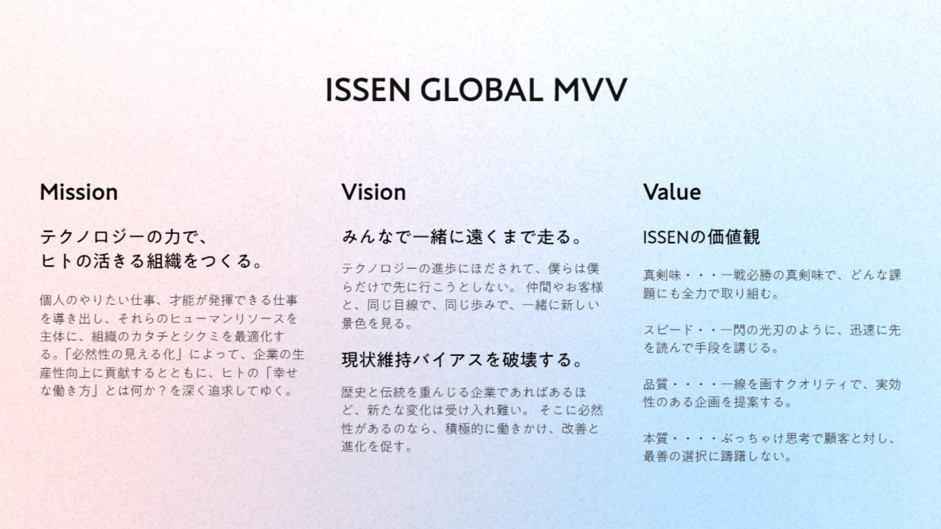 ISSEN GLOBALが掲げる理念は、「テクノロジーの力で、あるべき場所に、いるべきヒトを配置し、人が活きる組織をつくる」ことです。その背景には、「人の才能は常に発揮できるわけではない。だからこそ、その人が活きる環境を整えたい」という強い想いがあります。