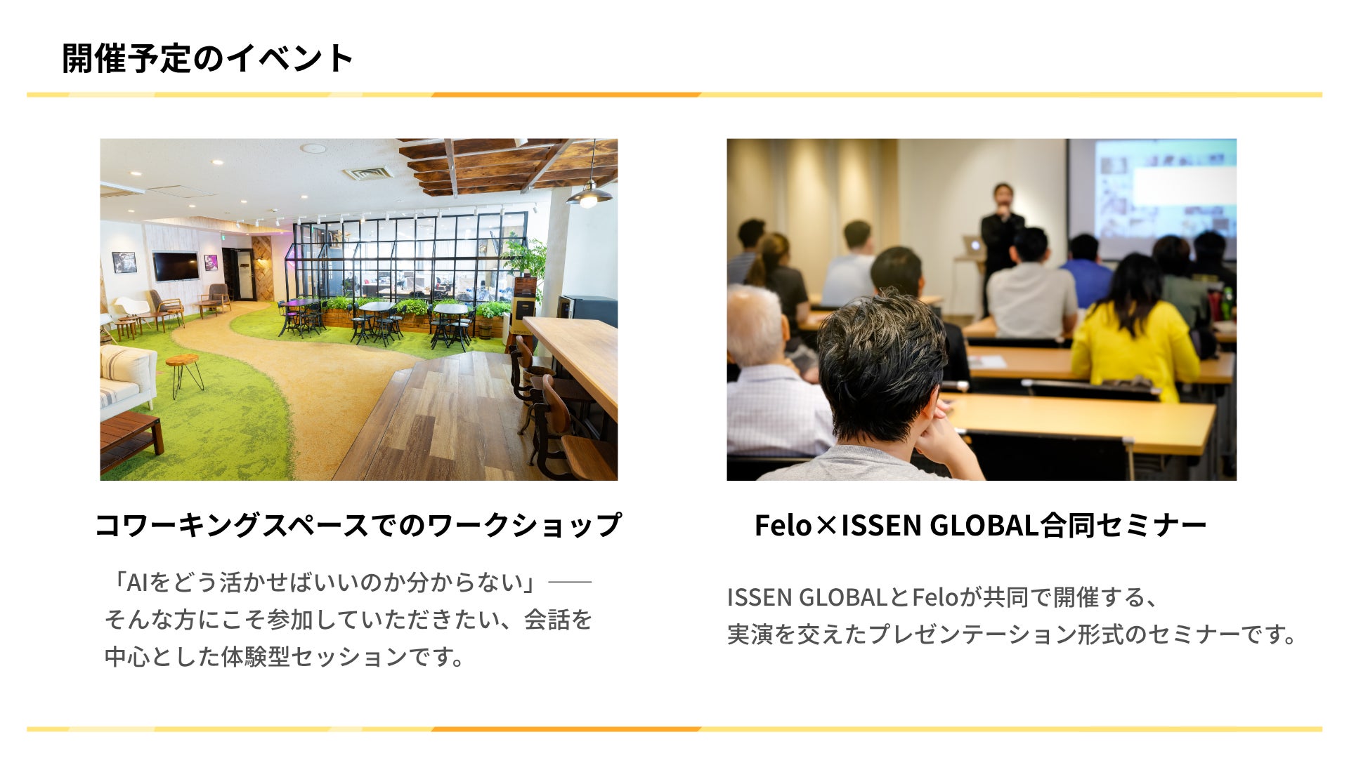 また、「Felo × ISSEN GLOBAL」として、地域の企業や団体の皆さまと共に、生成AIを自分たちの味方にしていくためのセミナーやワークショップを開催していきます。