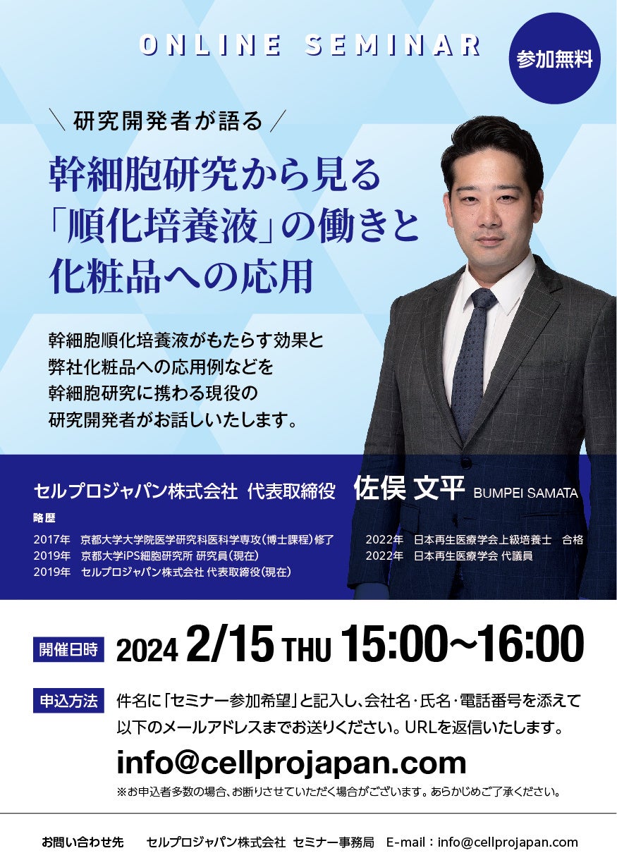 2月15日(木)セルプロジャパン代表取締役を務める佐俣文平が特別オンラインセミナーを開催!【テーマ】幹細胞研究から見る「順化培養液」と化粧品への応用