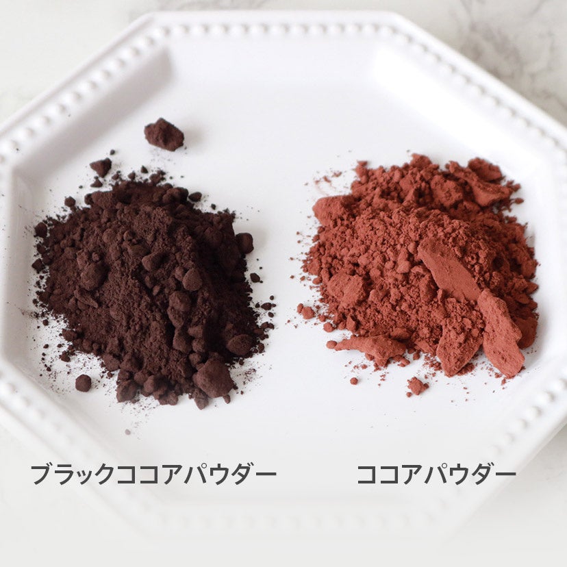 ブラックココアとは、原料は普通のココアと同様のカカオ豆を使用。ココアの製造工程でアルカリ処理の濃度や温度・時間など調整し、黒さを引き出すことでブラックココアパウダーとなります。カカオの風味は抑えられ、ほろ苦さを感じる仕上がりに。これが大人の味の秘密。