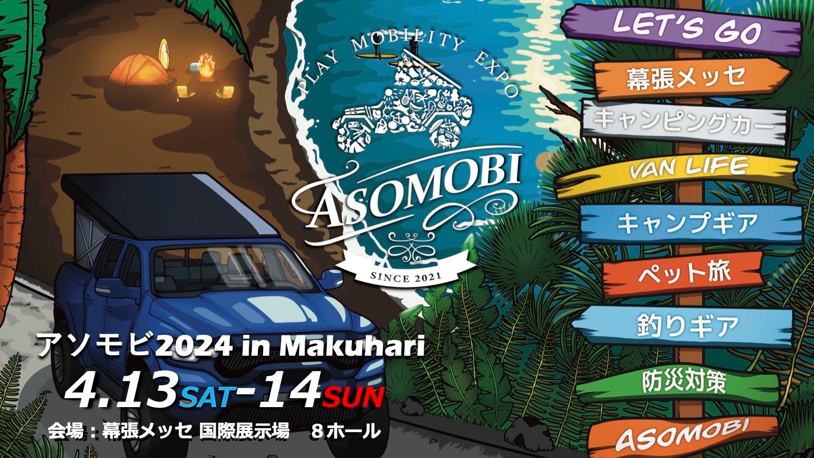 アソモビ2024実行委員会は、今回「テマヒマを楽しむ“遊び方の自由研究所”」をテーマに、最新のキャンプグッズ、こだわりの車中泊車や憧れのキャンピングカー、数多くのワークショップ体験などが揃う“遊び方”の祭展『アソモビ2024 in Makuhari』を、2024年4月13日(土)と14日(日)の2日間、幕張メッセで開催します。