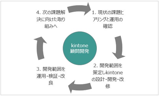 ダンクソフトでは、kintoneの開発において、「顧問開発」という形態を基本としています。これは「あらかじめ契約で定めた内容を納品して完了」というものではなく、変化の早い時代に対応してその時々の課題を解決するため、月次の定額でアプリの開発や変更を進めていく方法です。顧問開発により、システムを常に最適なものにしていくことができます。また、お客様の特別な環境や課題、業種のバックグラウンドなどに配慮した開発も可能にします。
