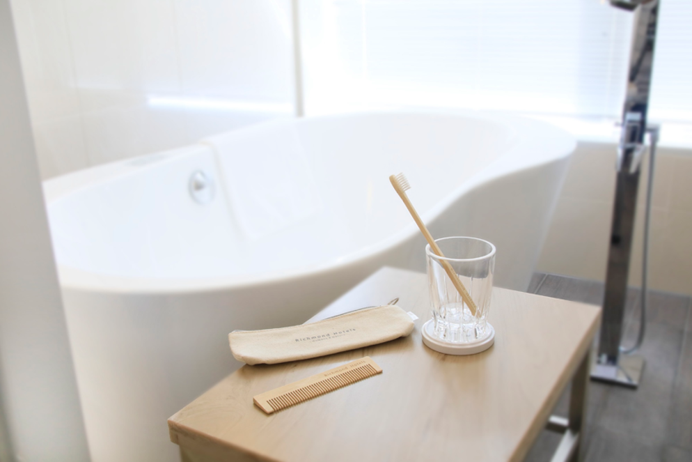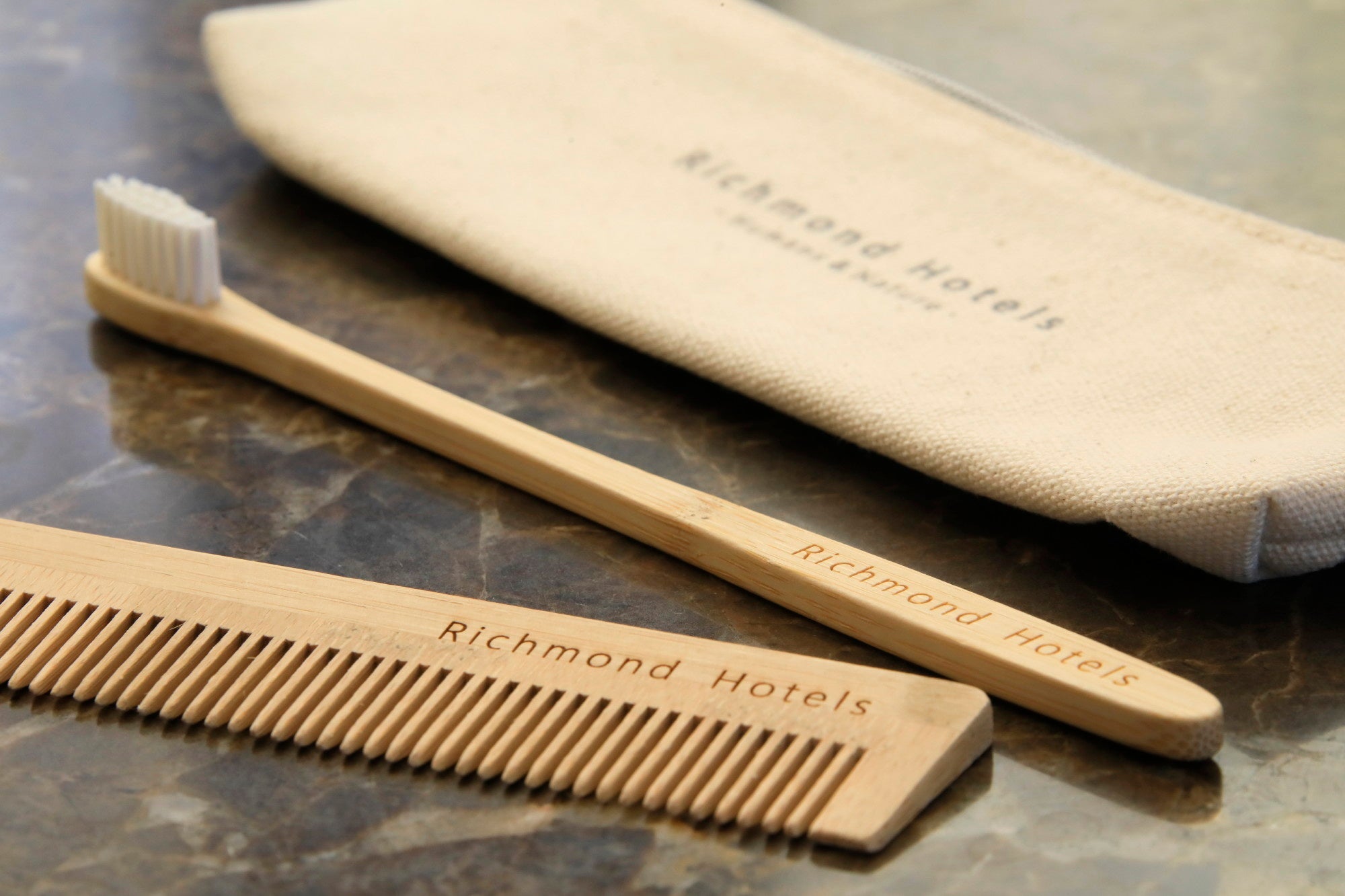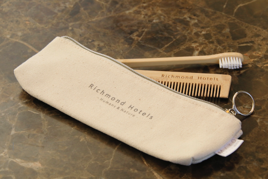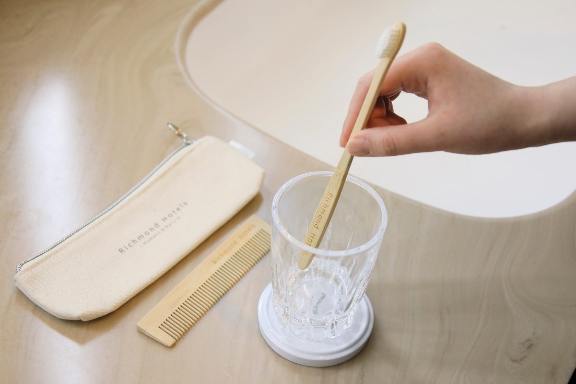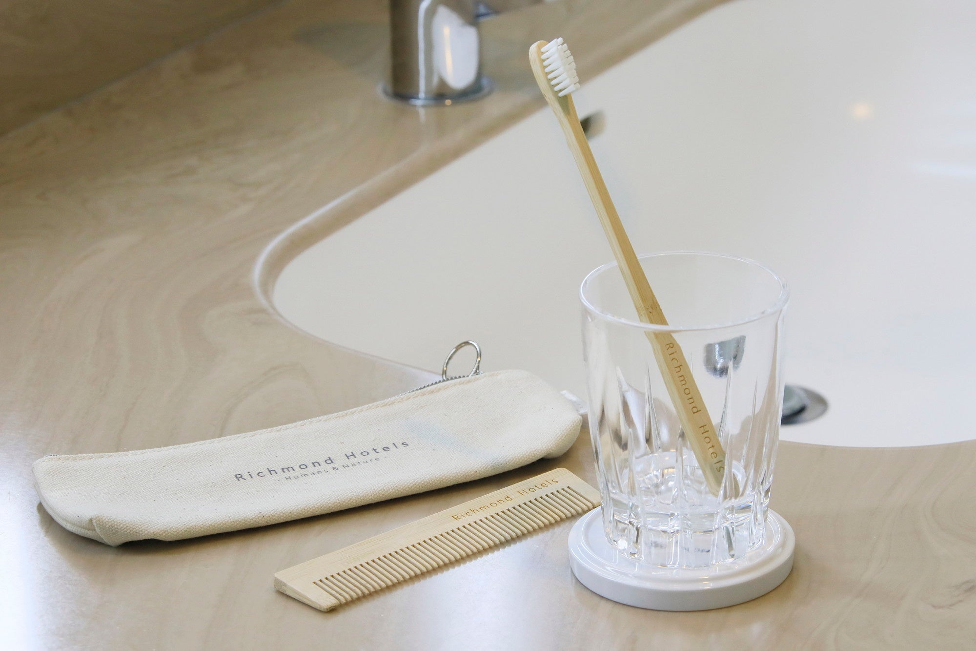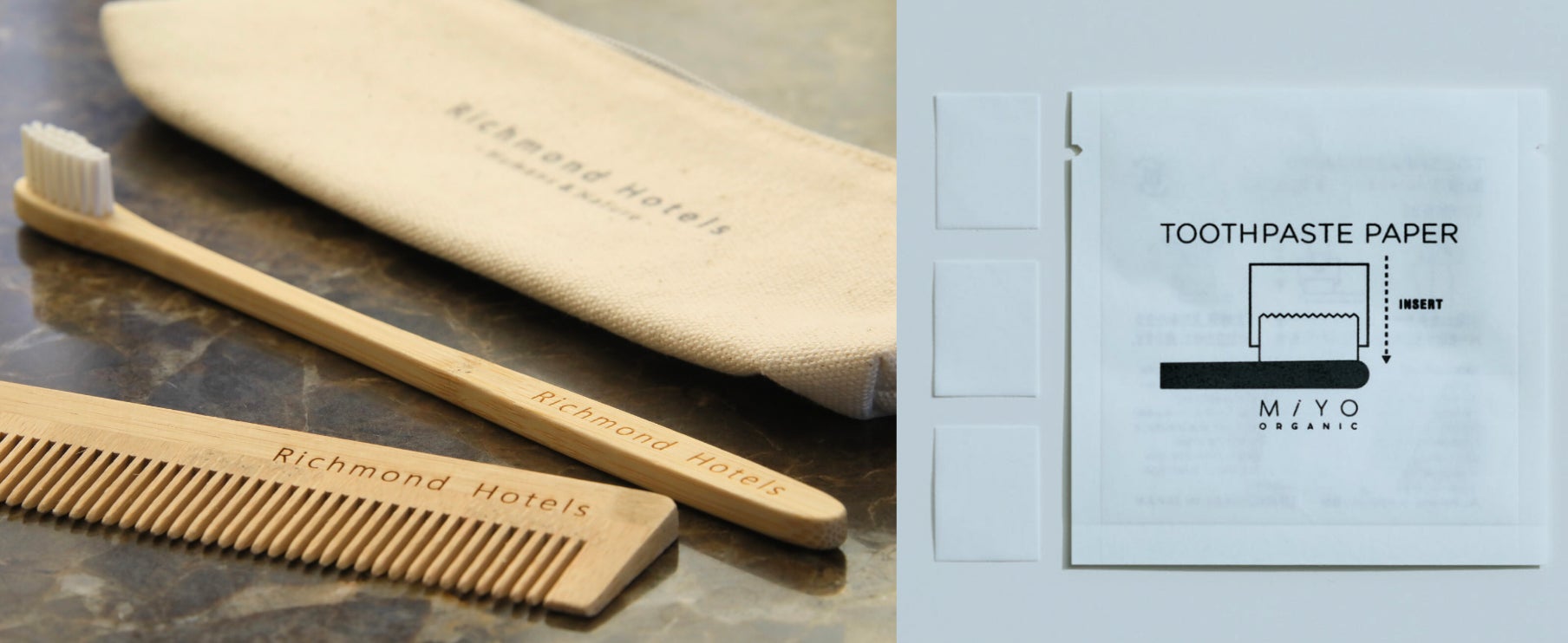 旅の拠点に最適なロケーションに位置するリッチモンドホテルズで、環境に配慮されたエシカルな日用品が「リッチモンドホテルズ オリジナルトラベルキット」として販売されます。ホテルのオリジナルデザインで制作された「オーガニック竹歯ブラシ」や「オーガニック竹ヘアコーム」、「持ち歩きコットンポーチ」に加え、従来のチューブタイプと比べてプラスチックを約98%削減できる「歯磨きペーパー」もお取り扱いいただきます。紙パッケージを採用することで、できる限りプラスチックを使用しない包装にもこだわっていただきました。つい持ち帰って日常でも使用したくなるようなシンプルなデザインで、旅先でも日常でも気分を上げながら環境にも配慮することができるエシカルなアメニティです。