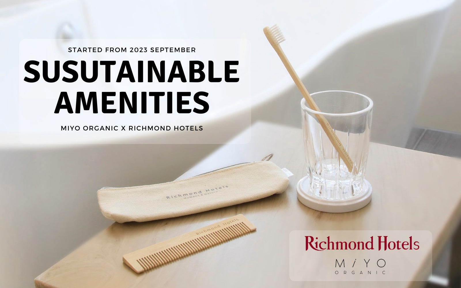 世界中で1年間に廃棄されるプラスチック歯ブラシの量は約36億本にのぼるとも言われています。MiYO ORGANICでは、地球環境に配慮した安心・安全な心地よい選択肢を作り、日常の小さなところから世界にいい変化を起こせないかと考え、日用品やホテルアメニティとなる商品を開発・販売しています。リッチモンドホテルズが掲げるプラスチック使用量削減に向けた試みとして、MiYO ORGANICの「使い捨てないアメニティ」への想いに共感していただき、25都道府県43ホテルでの販売が実現しました。