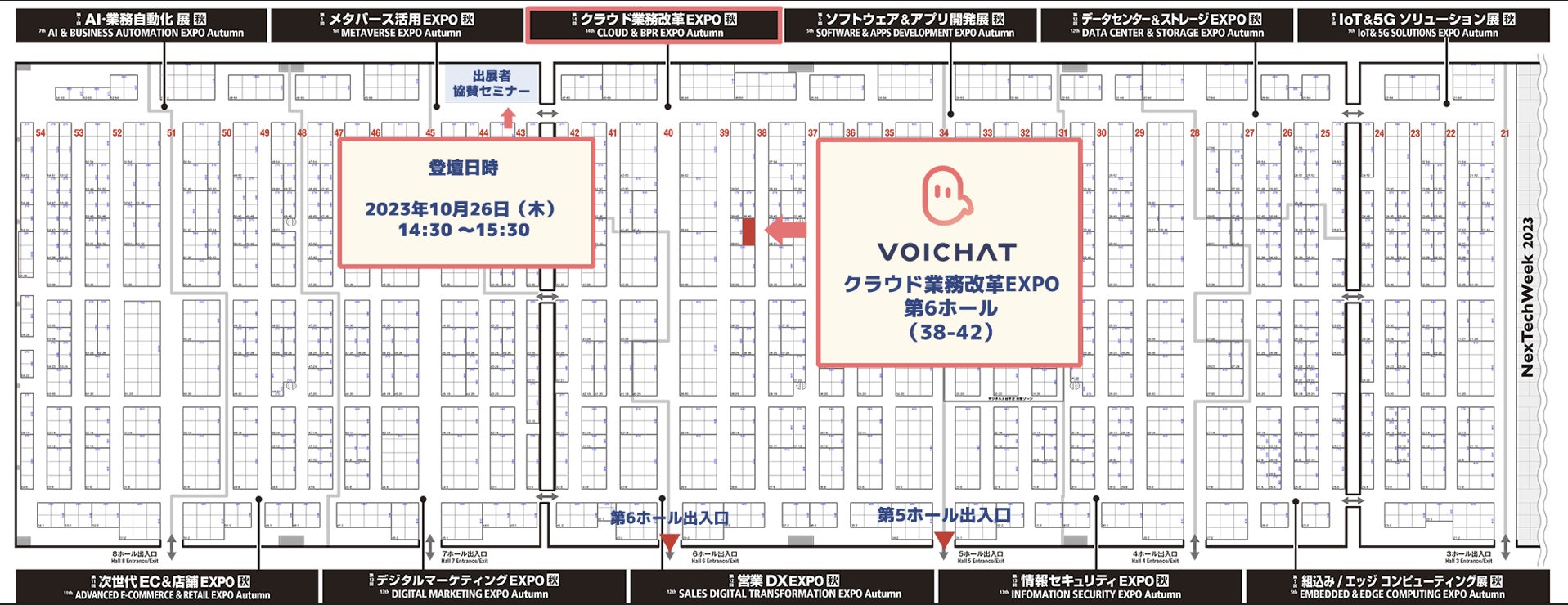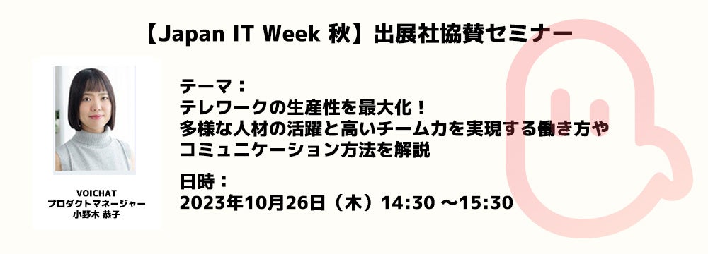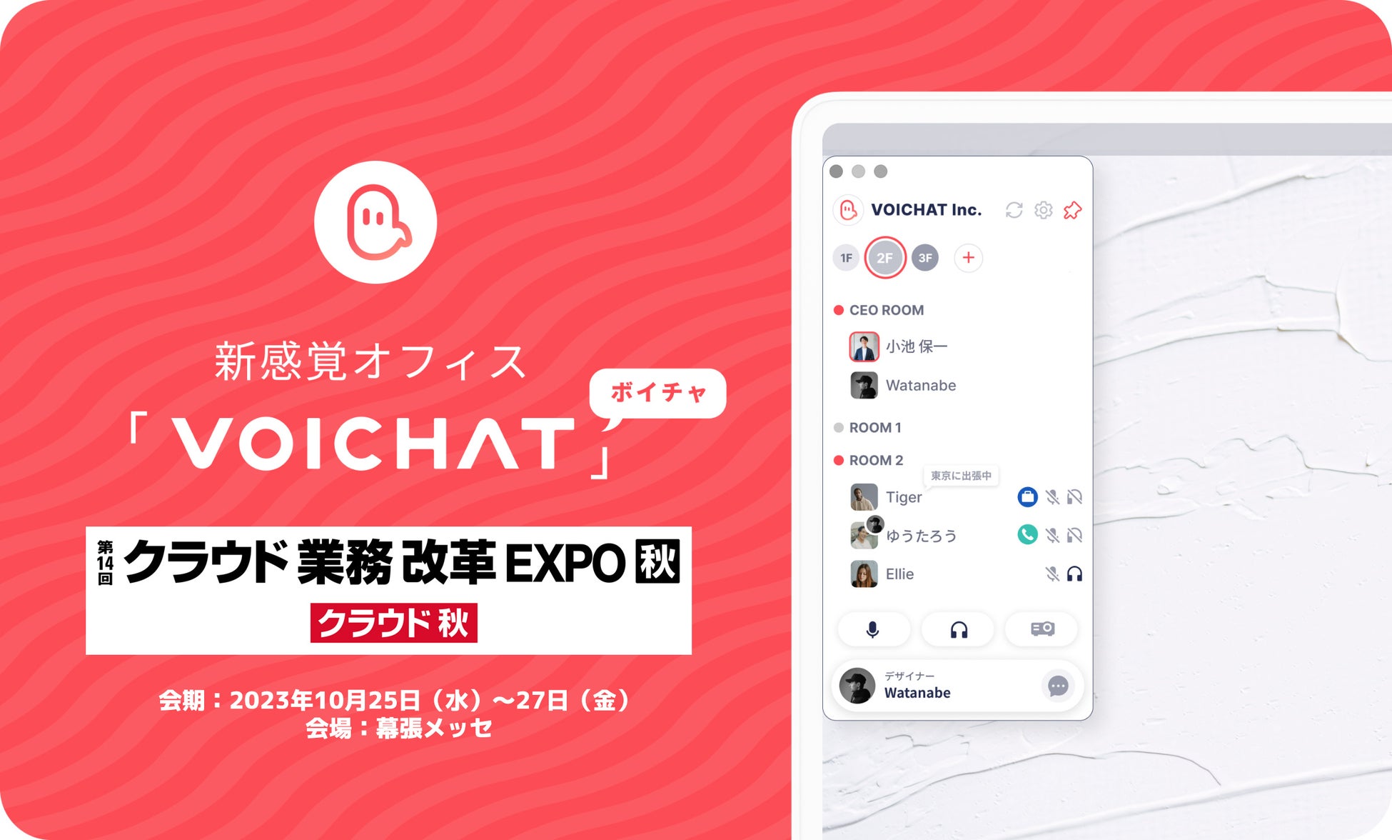 VOICHAT株式会社(代表取締役CEO:小路康丸)は、2023年10月25日(水)~27日(金)で幕張メッセで開催される、「Japan IT Week 2023」に出展します。ご来場の際は、ぜひ「第14回 クラウド業務改革EXPO【秋】」内の弊社ブースにお立ち寄りくださいますよう、よろしくお願い申し上げます。